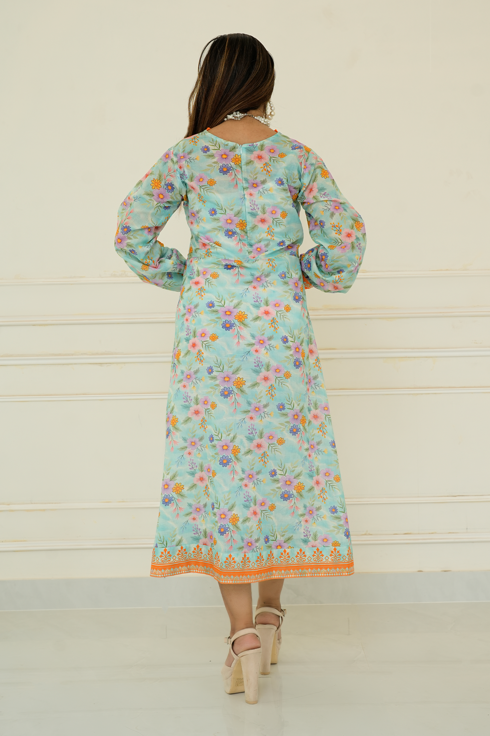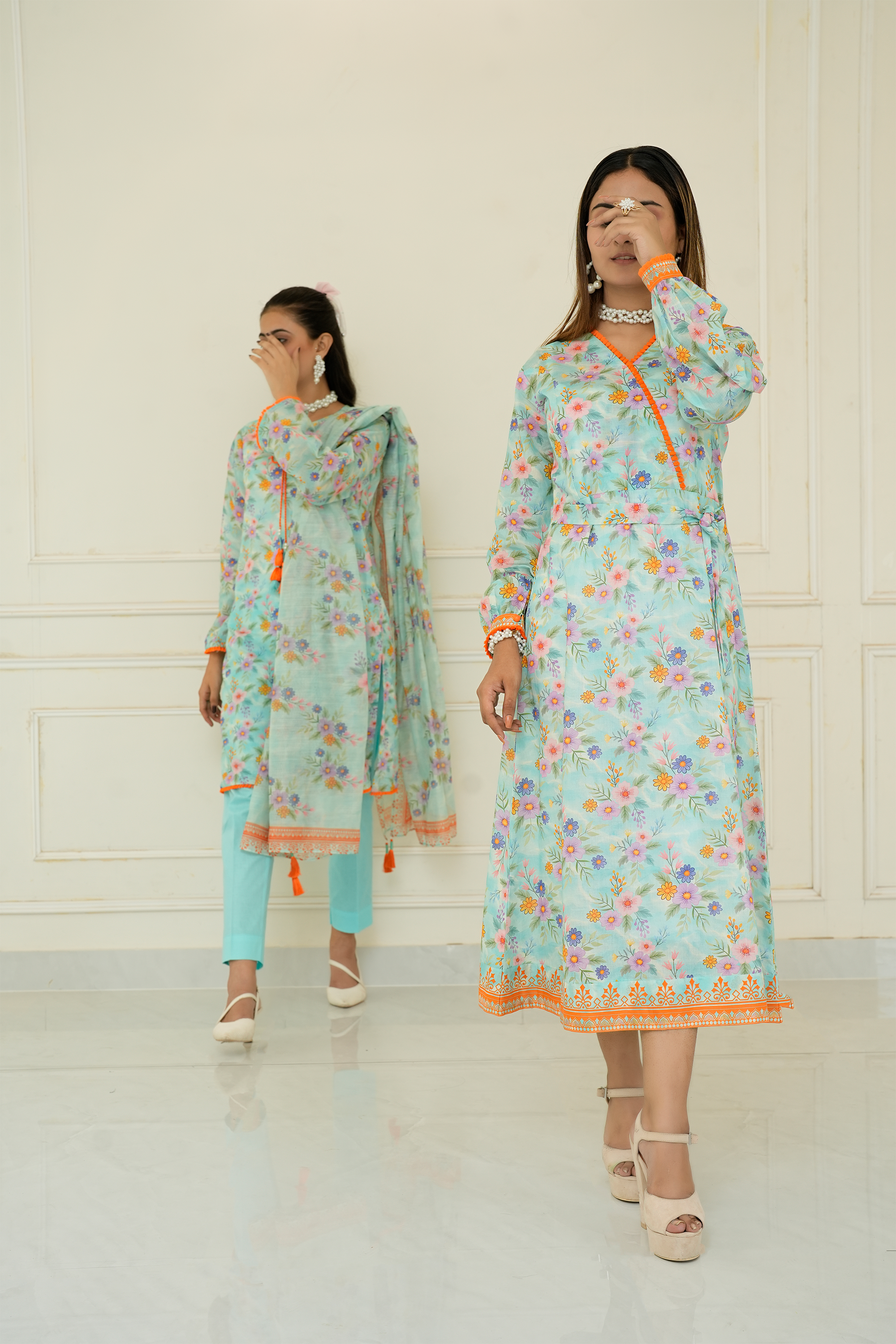 Radiate playful charm with the "Aleeza" western stitched frock and trouser set. This ensemble features a wrap-style frock with a cheerful floral print and vibrant orange details. Available in sizes XS, S, M, L, XL, and Custom Size.