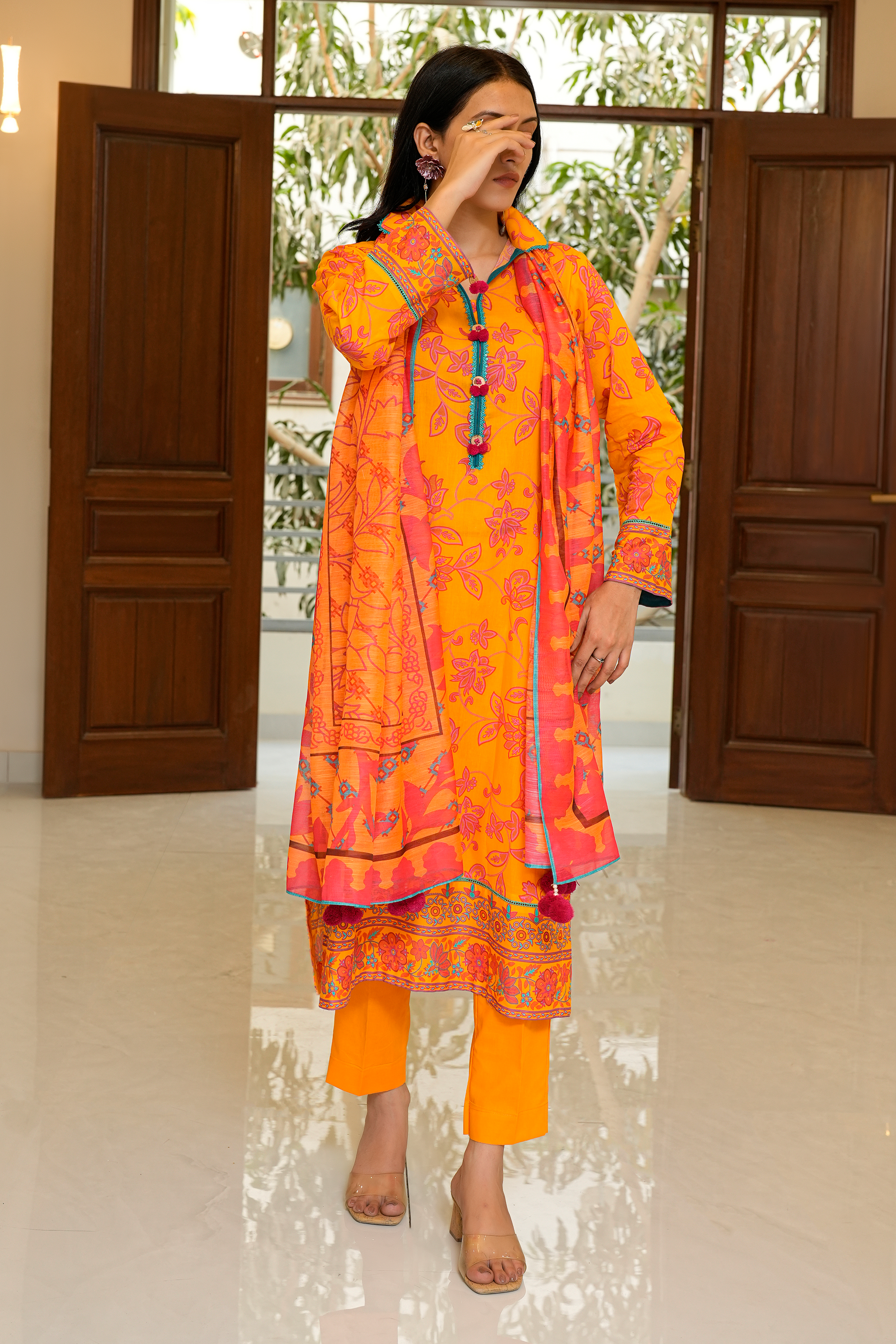 Embrace the radiant warmth of "Elaya," a design that bursts with vibrant hues and floral charm. Choose your preferred style: the creative freedom of unstitched fabric or the ready-to-wear vibrancy of our eastern stitched option.