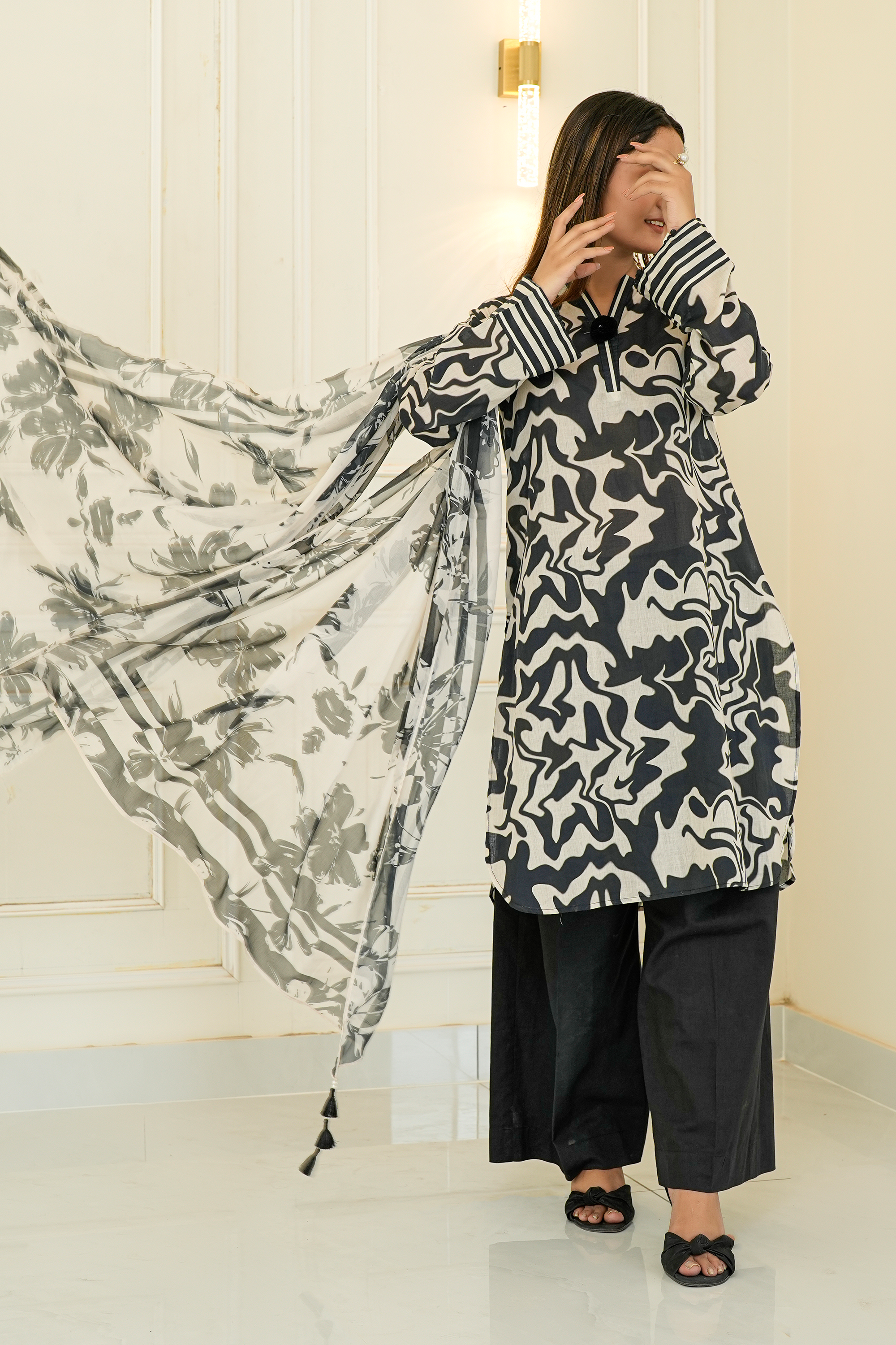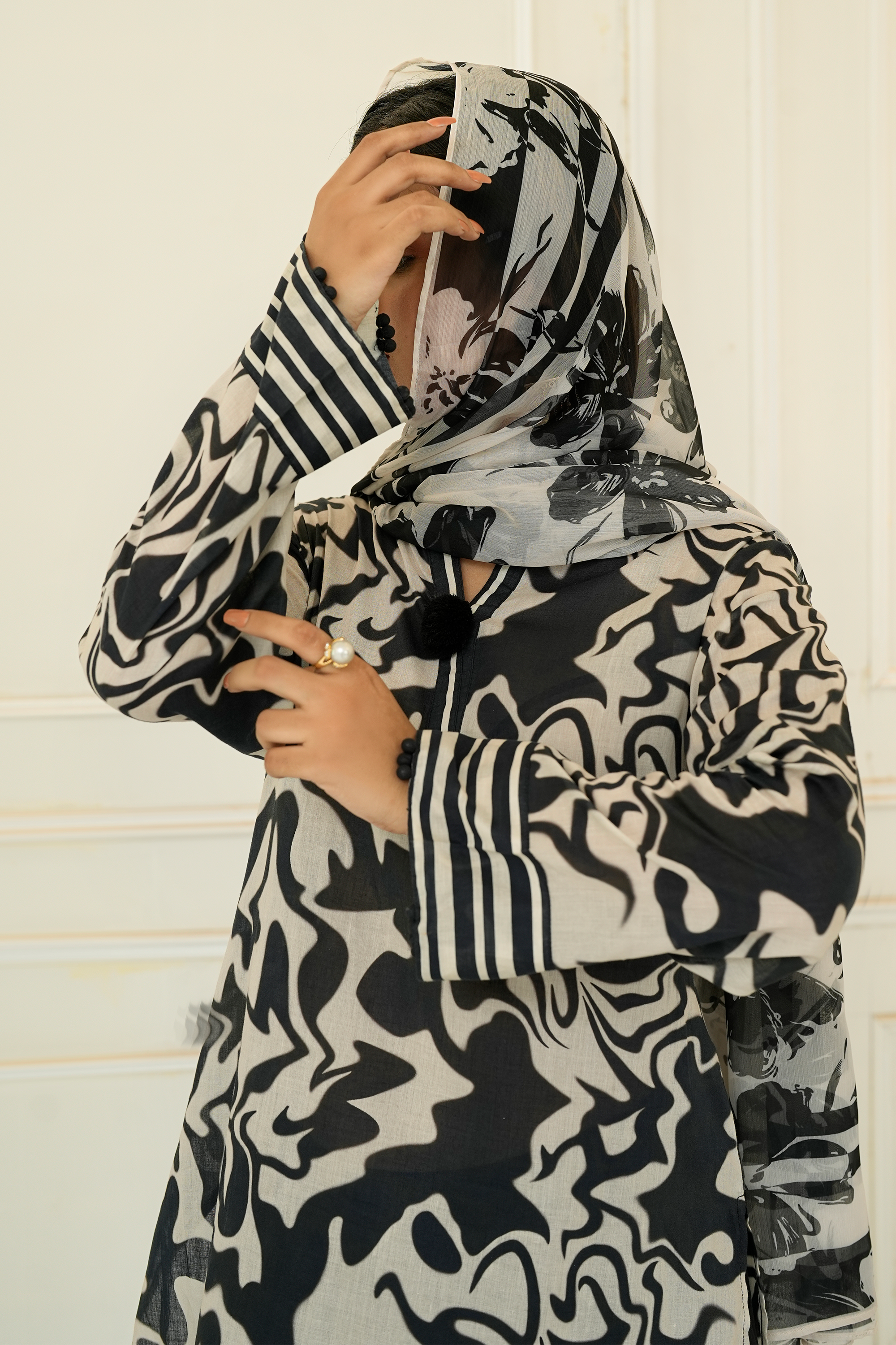 Embrace the striking contrast of "Silaah," a design that captures modern artistry in a monochrome palette. Choose your preferred style: the creative freedom of unstitched fabric or the ready-to-wear sophistication of our eastern stitched option.