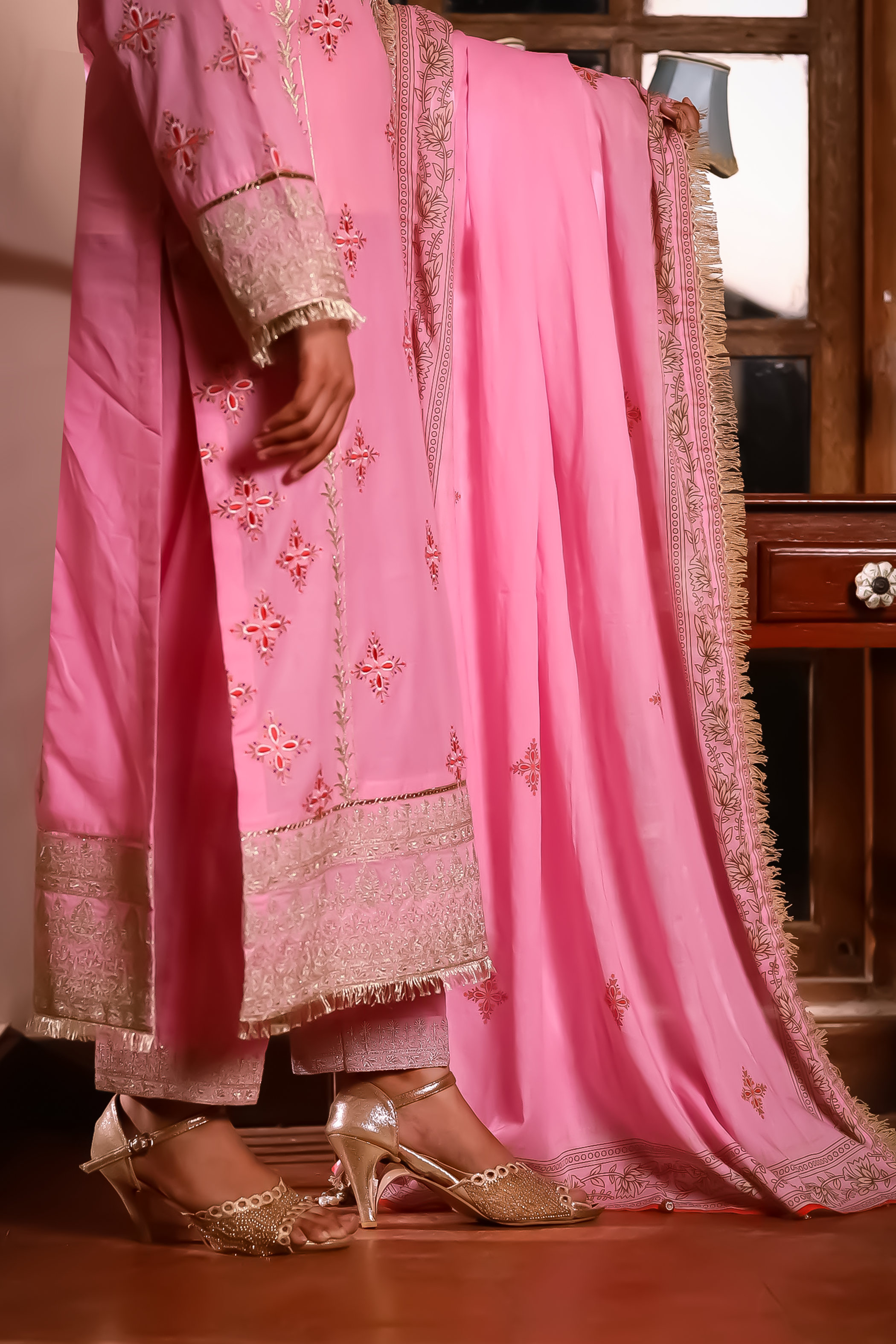 Jahanara is a statement of grace and luxury, meticulously crafted for women who love intricate details and traditional elegance. The design blends Mughal-inspired embroidery with a modern silhouette, making it an ideal choice for festive and celebratory occasions.
