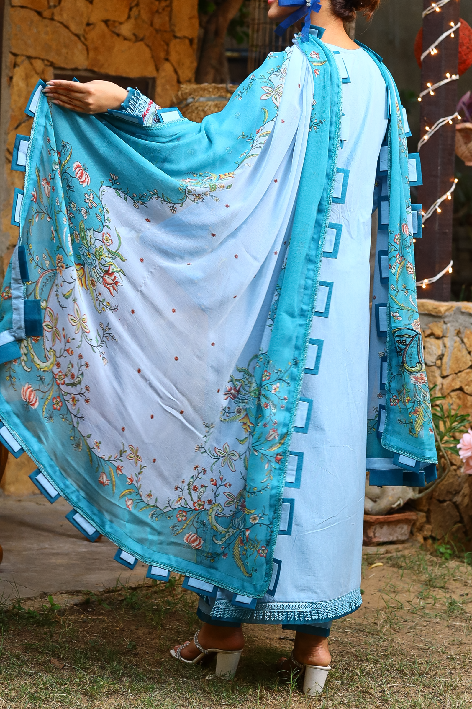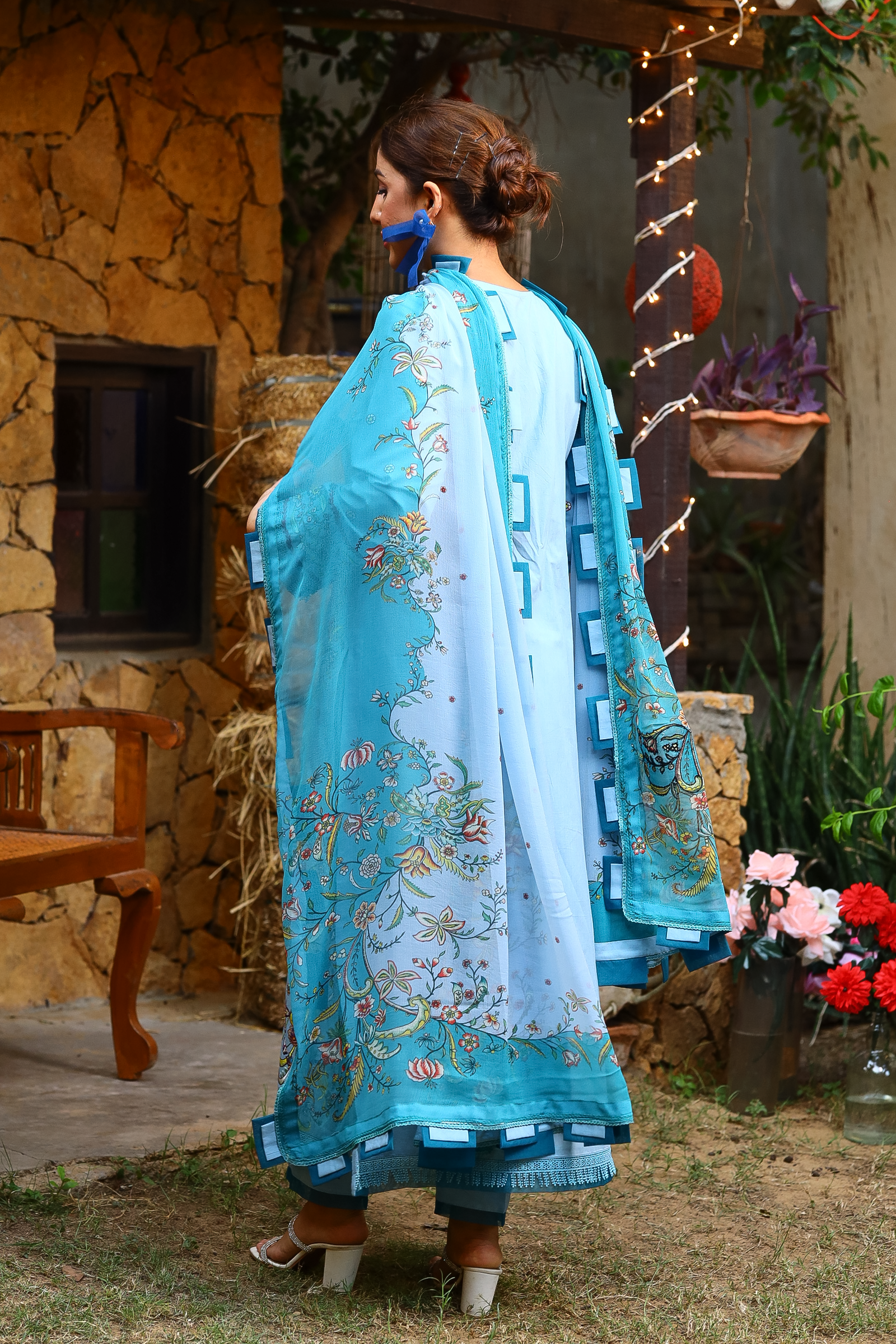 The chiffon printed dupatta is a lightweight and flowy statement piece with a delicate floral print that harmonizes with the embroidery on the shirt. The turquoise contrast and intricate printed motifs give it a modern yet elegant touch, making it perfect for summer wear.
