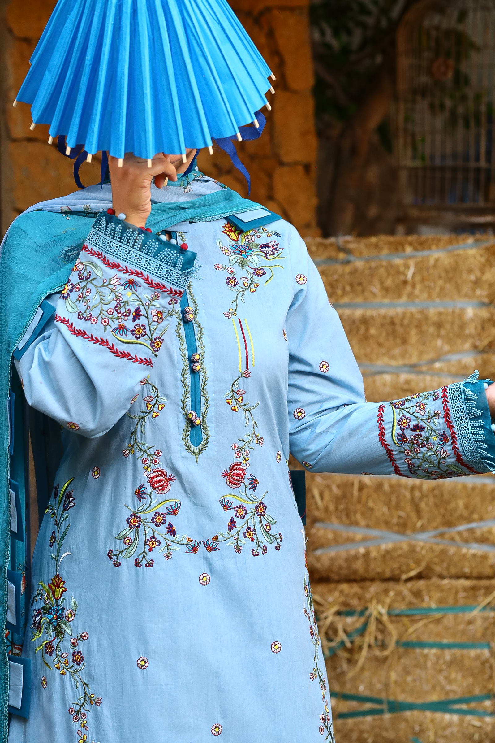 Nazneen is a timeless fusion of floral elegance and intricate craftsmanship, designed for festive occasions like Eid, summer gatherings, and luxury daywear. The delicate embroidery, flowing silhouette, and contrasting details make it a standout choice for sophisticated dressing.