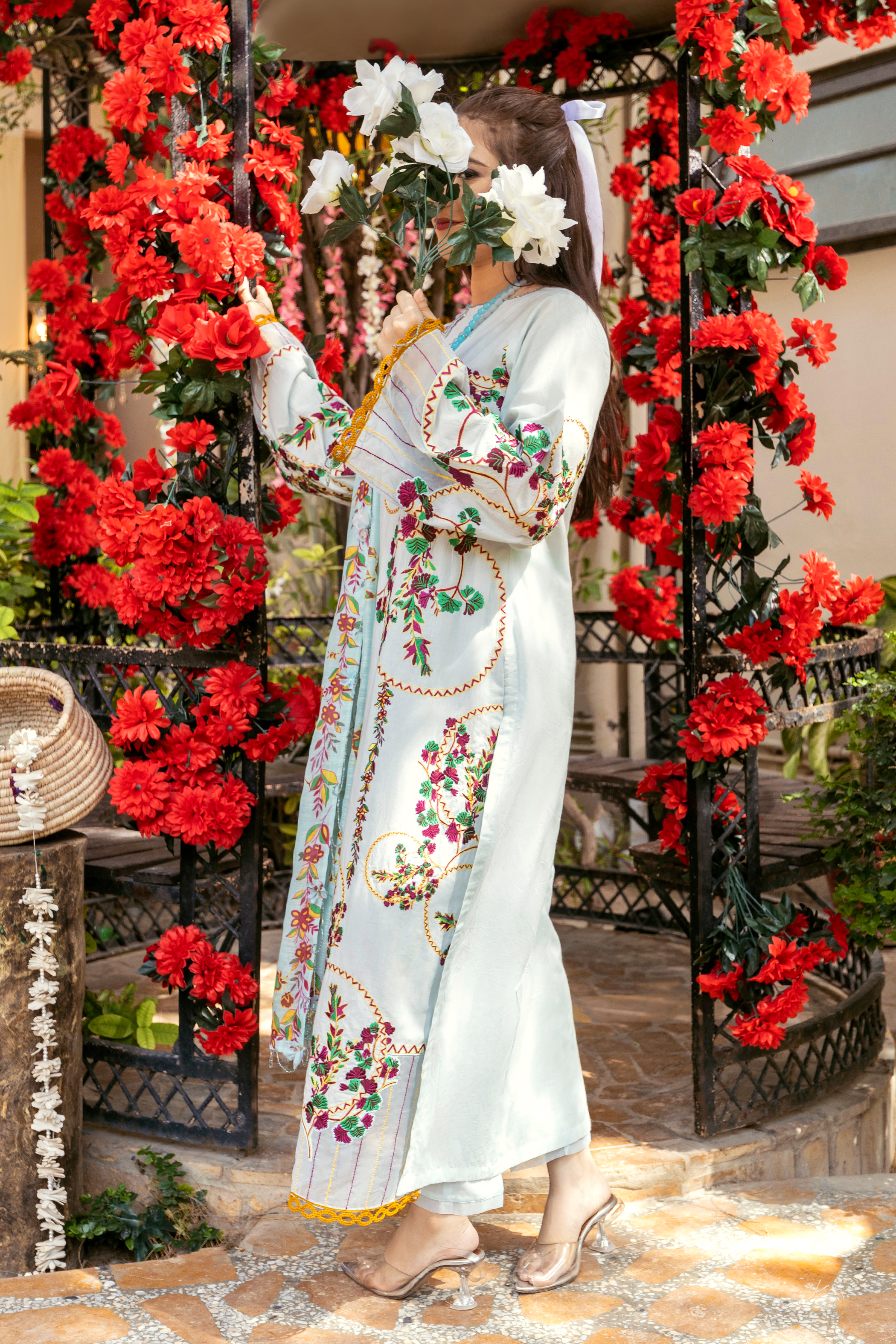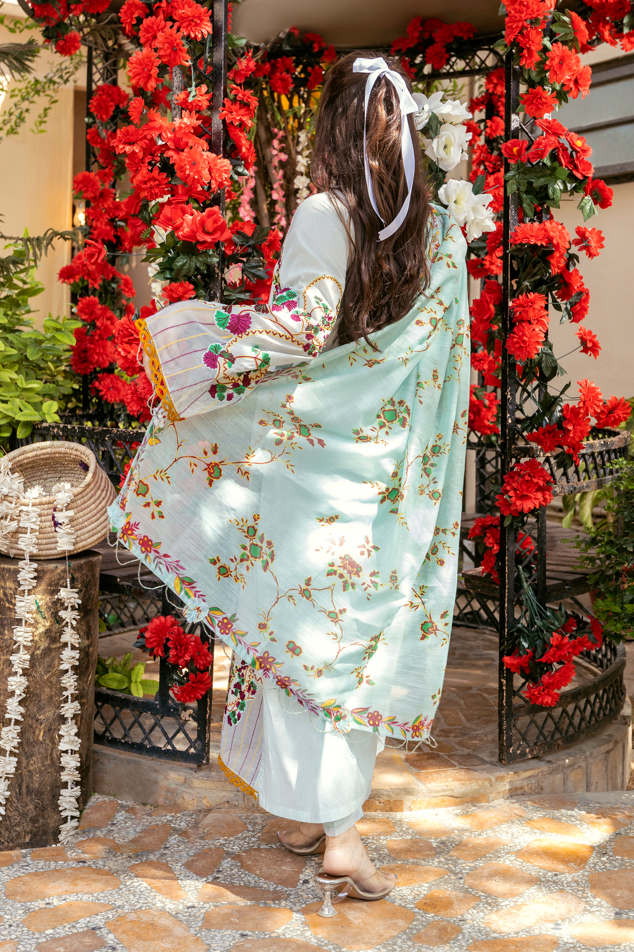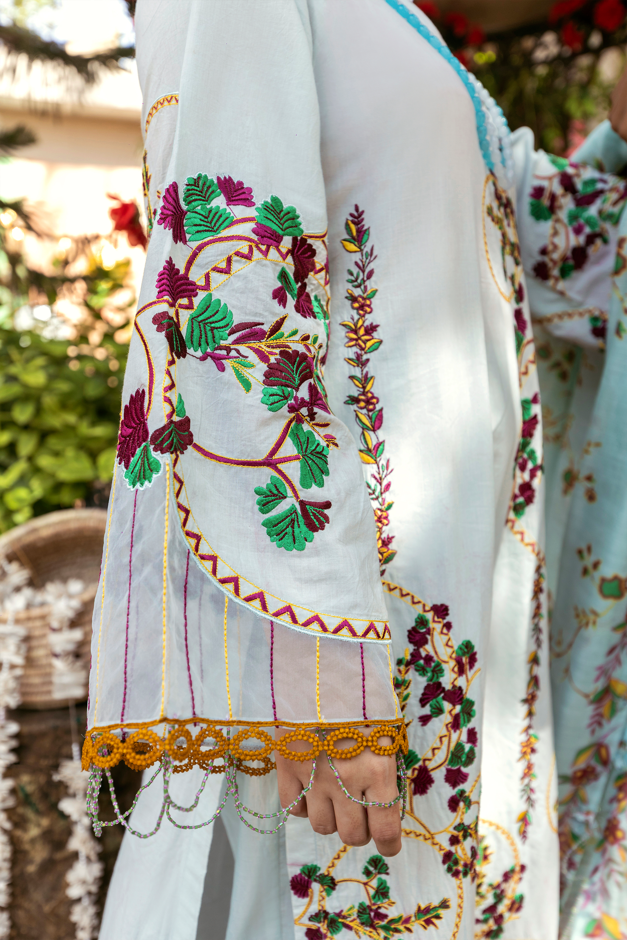 Zunaira is a fusion of delicate floral artistry and traditional craftsmanship, creating a fresh, elegant, and festive look. With its pastel hues and intricate embroidery, this ensemble is ideal for Eid, Ramadan gatherings, and summer soirées.
