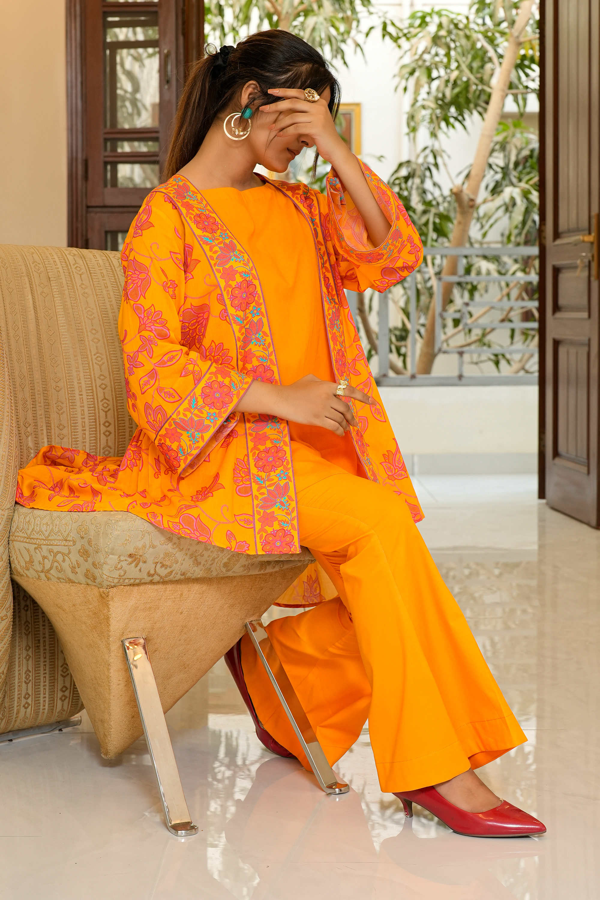 Radiate contemporary flair with the "Elaya" western stitched three-piece set. This ensemble features a stylish layered look with a vibrant floral print. Available in sizes XS, S, M, L, XL, and Custom Size.