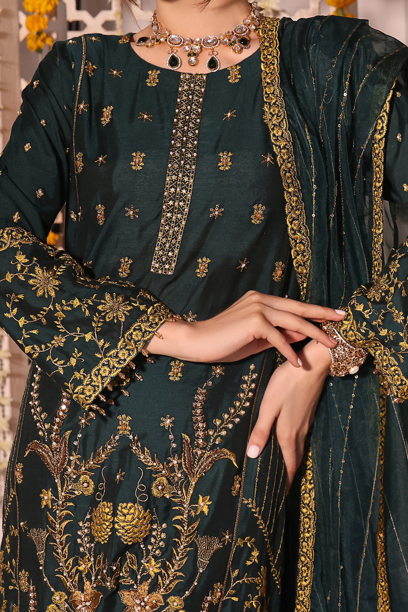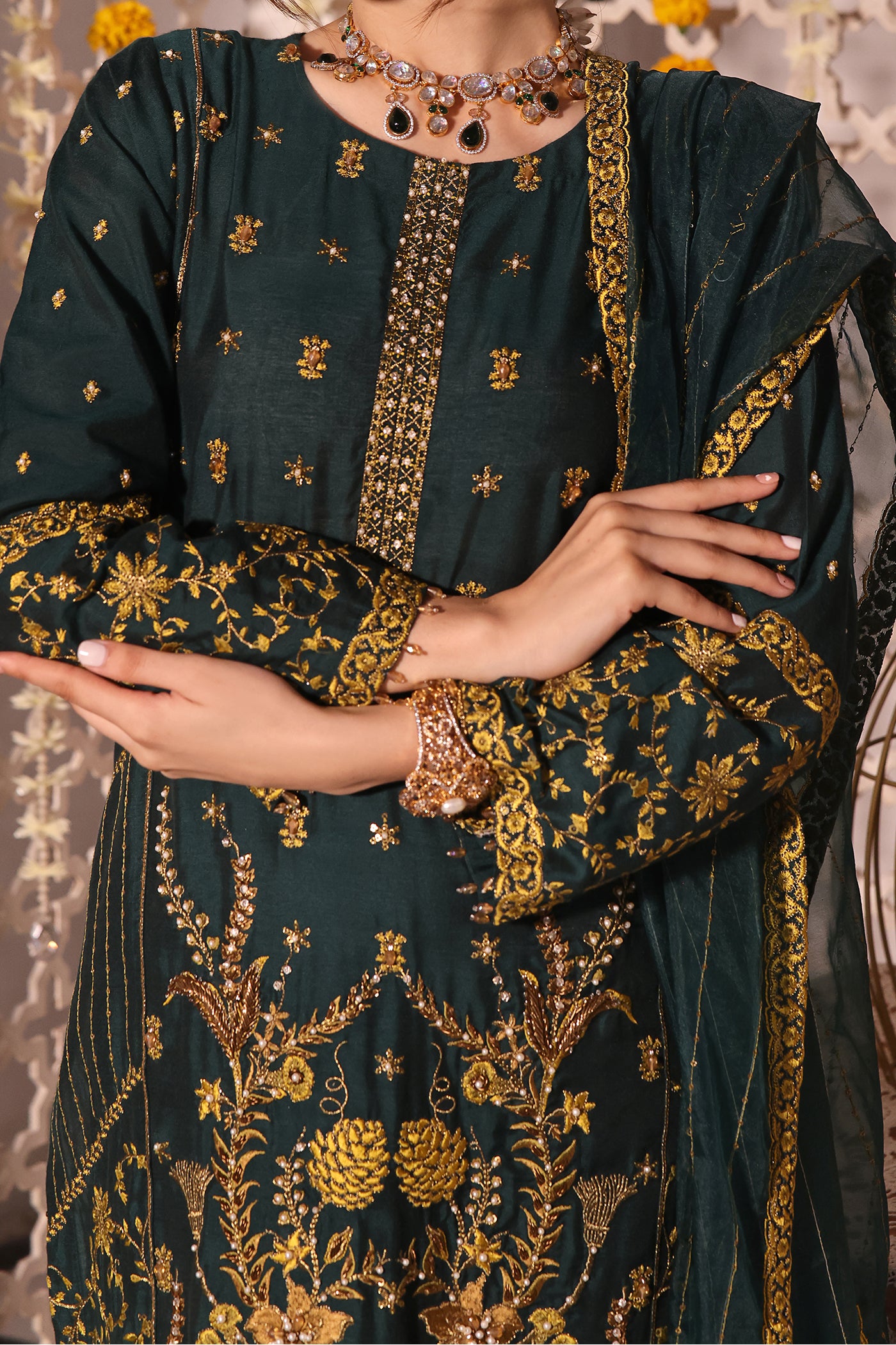 Graced with traditional embroidery, this celestial design showcases alluring embellishments of traditional aesthetics. The dupatta exudes stunning gold chain embroidery with an embroidered border and luxurious crystal hangings. A complementing trouser completes the look.