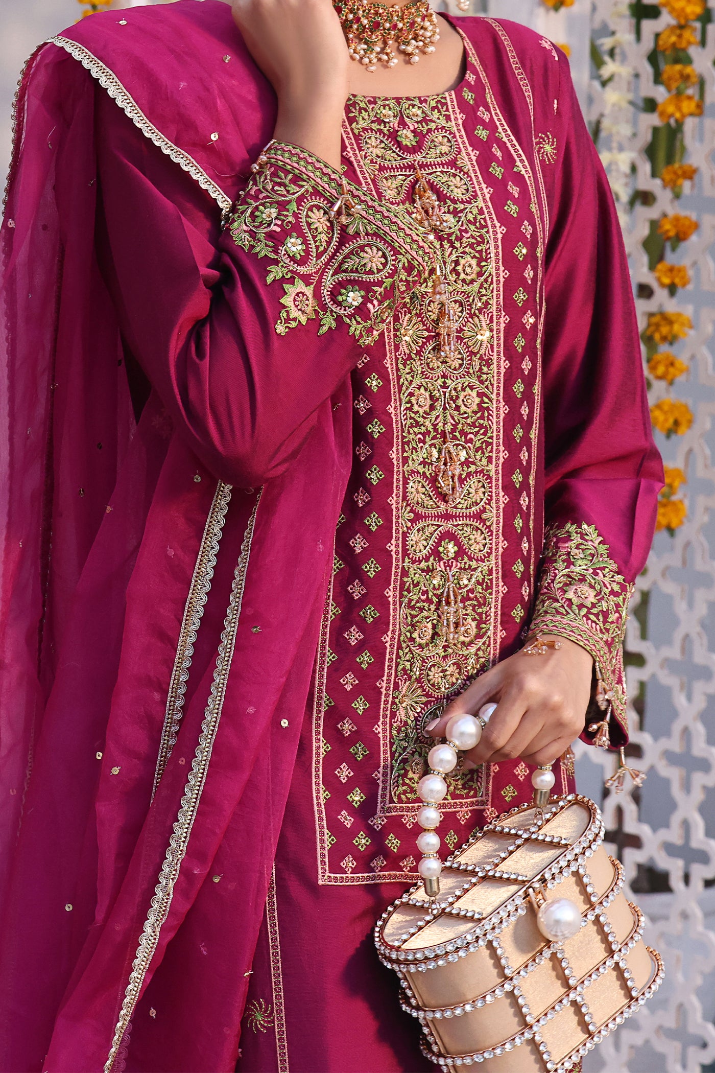 Experience luxury with our three-piece embroidered cotton-silk suit, adorned with meticulous sequin embroidery complemented by detailing. This masterpiece is paired with dyed straight-fit trousers and a resplendent dupatta graced with intricate gota lace and tassels on the borders, offering timeless allure at all your soirées.