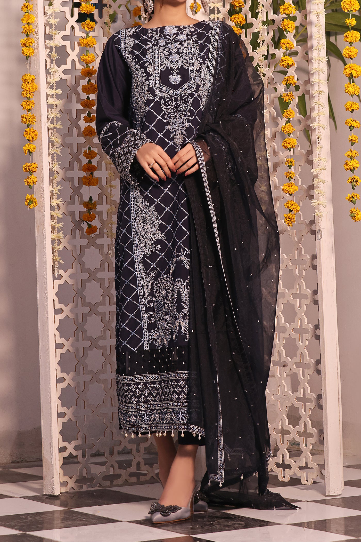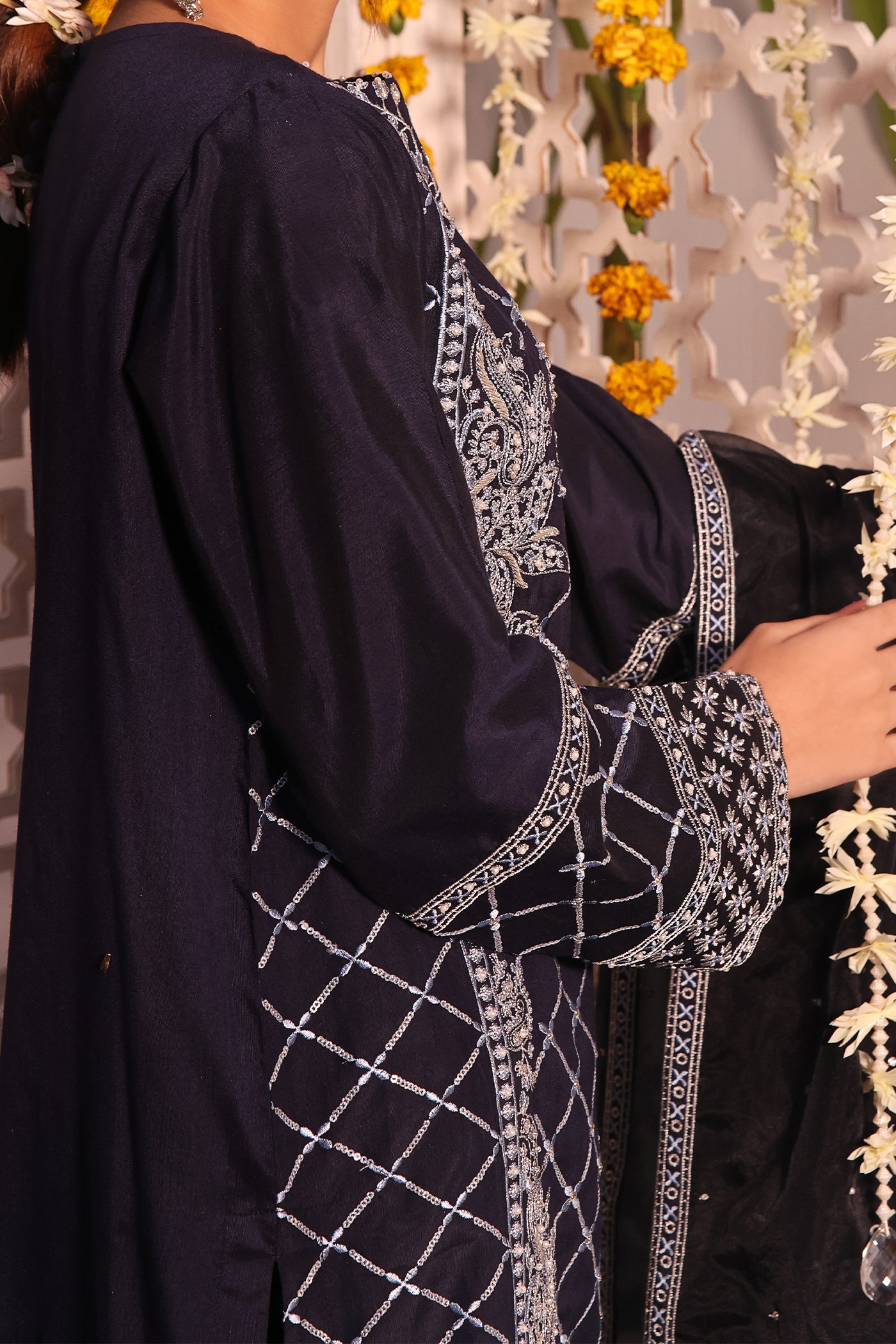 The stunning presidential blue outfit flaunts a criss-cross embroidered jaal design with hand-embellished sequins, moti, stones, dabka, and pearls on the border front and back. The dupatta exhibits a beautifully designed embroidered border. Dyed raw silk pants elevate the overall aesthetic.