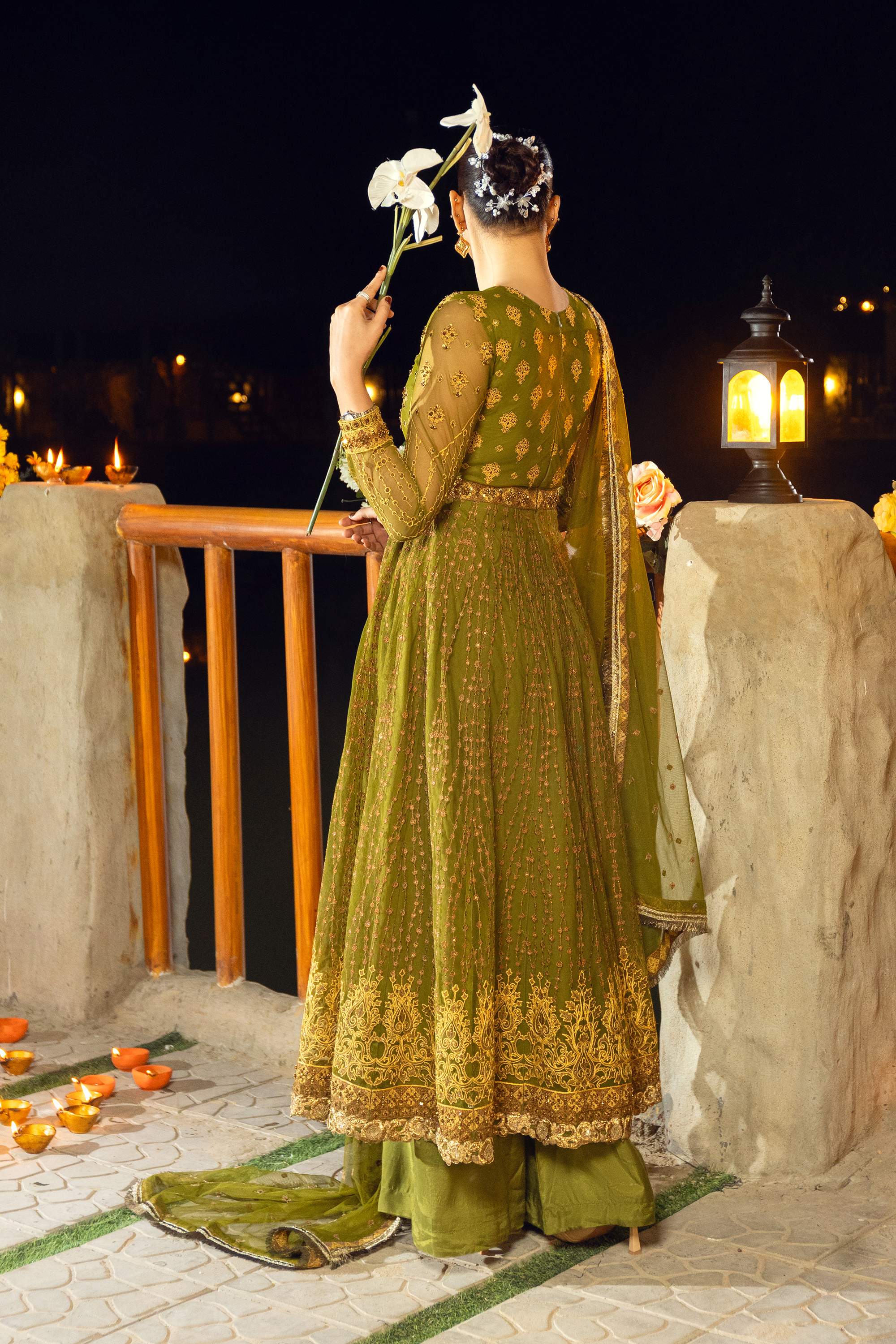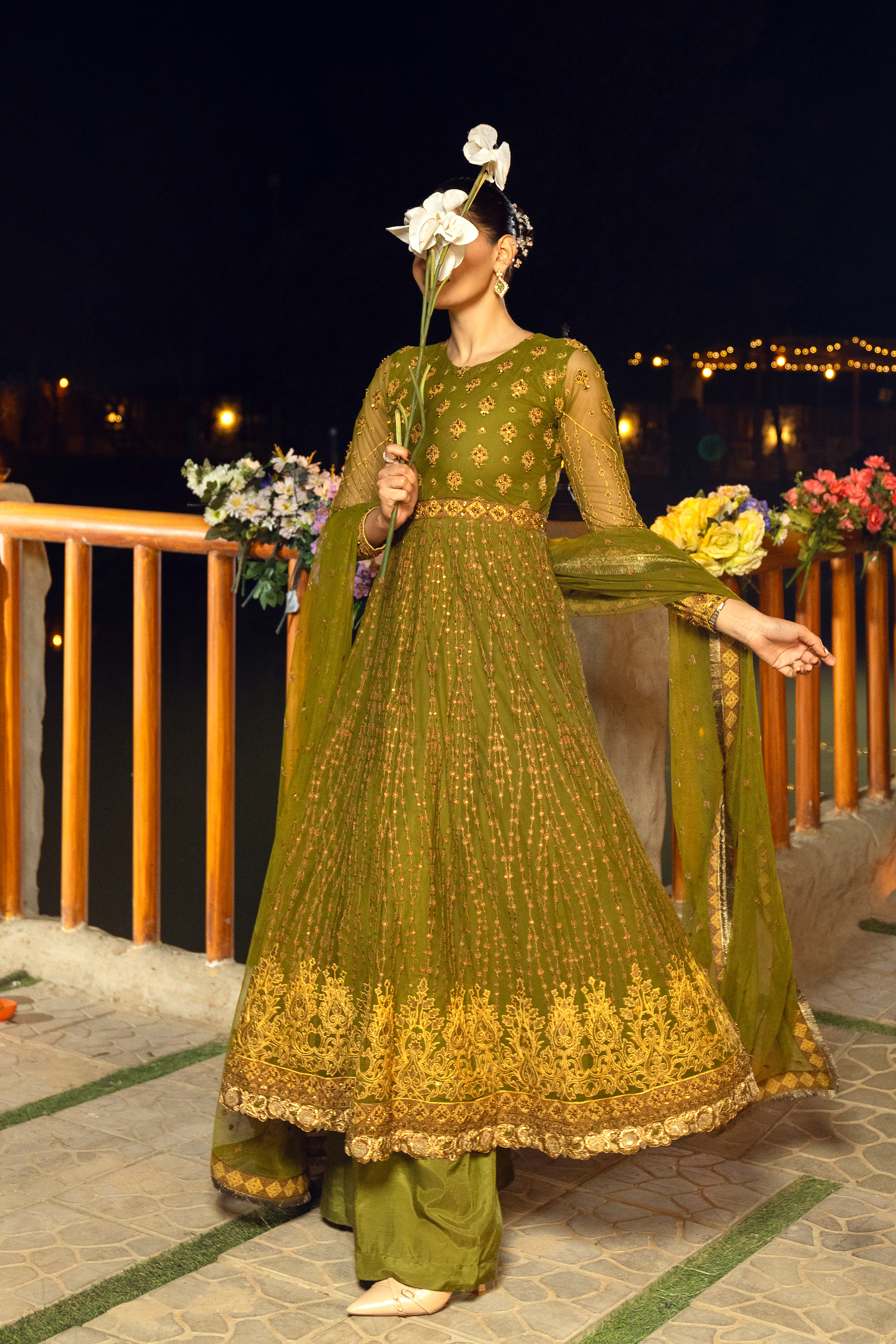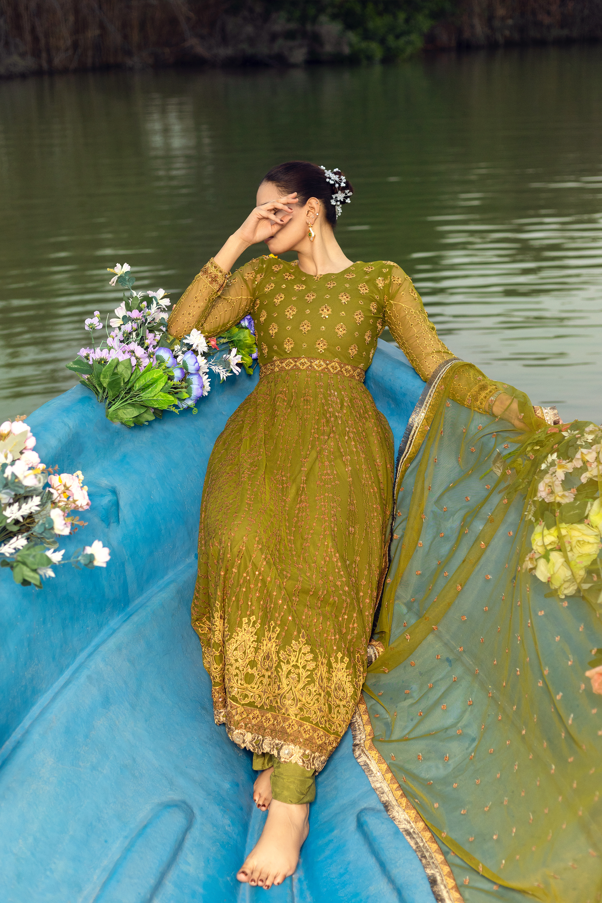Khired is a majestic maxi that embodies the essence of regal beauty. Designed with 12 embroidered kalis, 6 of which feature intricate handwork, this masterpiece reflects fine craftsmanship. The embellishments include stones, kora dabka, and sequins, adding a touch of grandeur. The design concept is inspired by Baroque and Royal aesthetics, blending traditional artistry with a luxurious appeal. Every kali is adorned with delicate detailing, creating a mesmerizing flow of embroidery that enhances the silhouette with an ethereal charm.