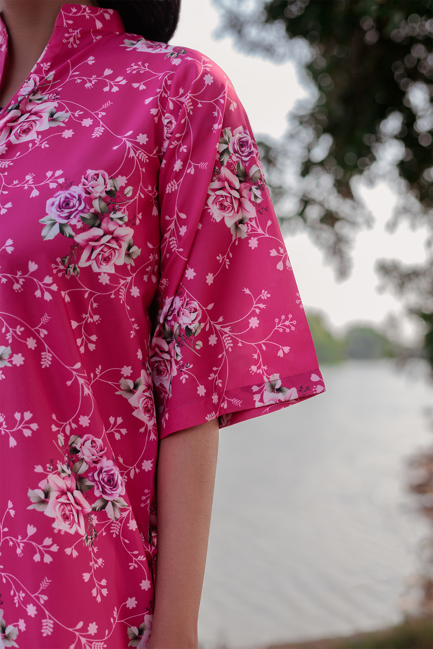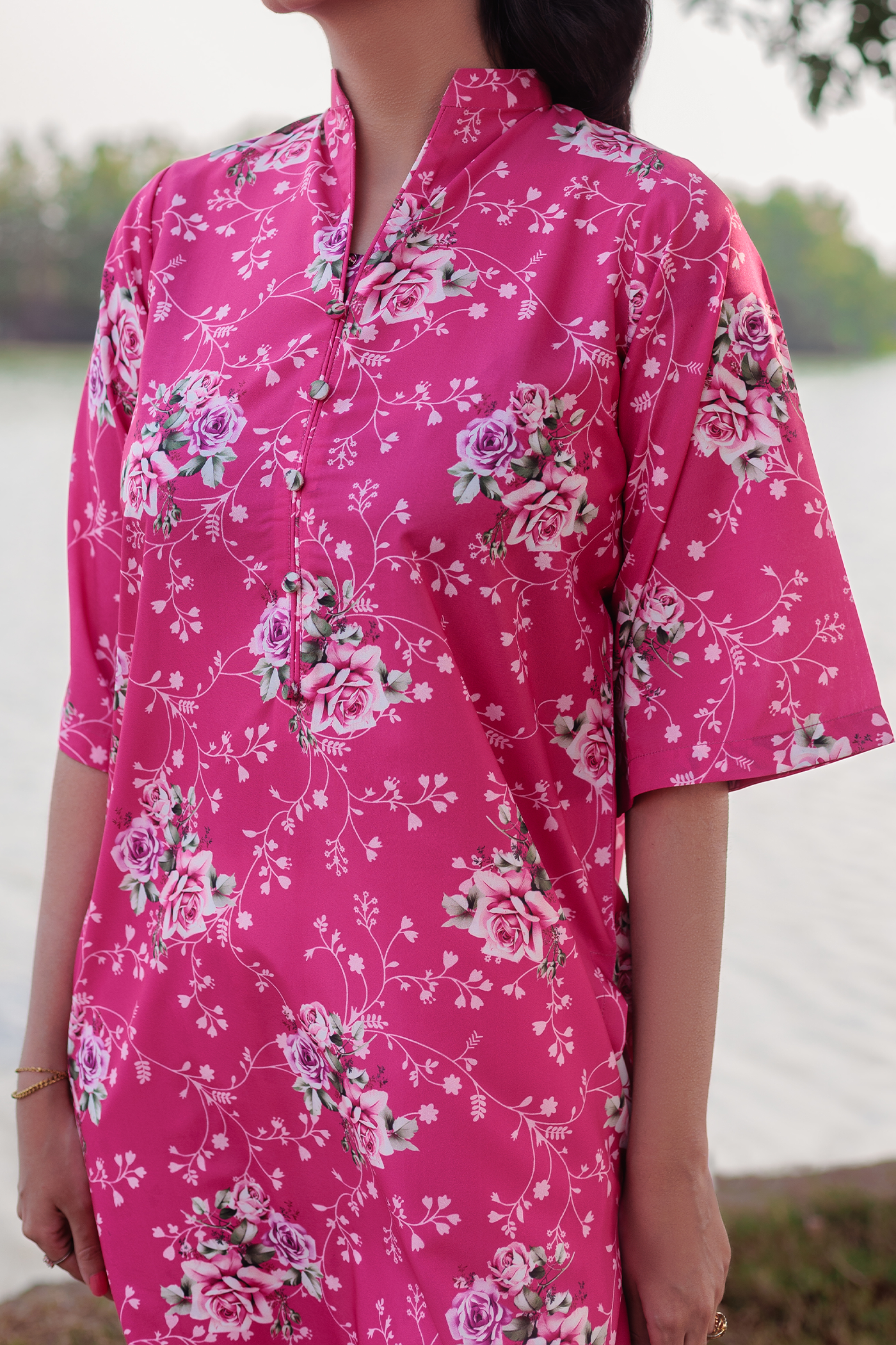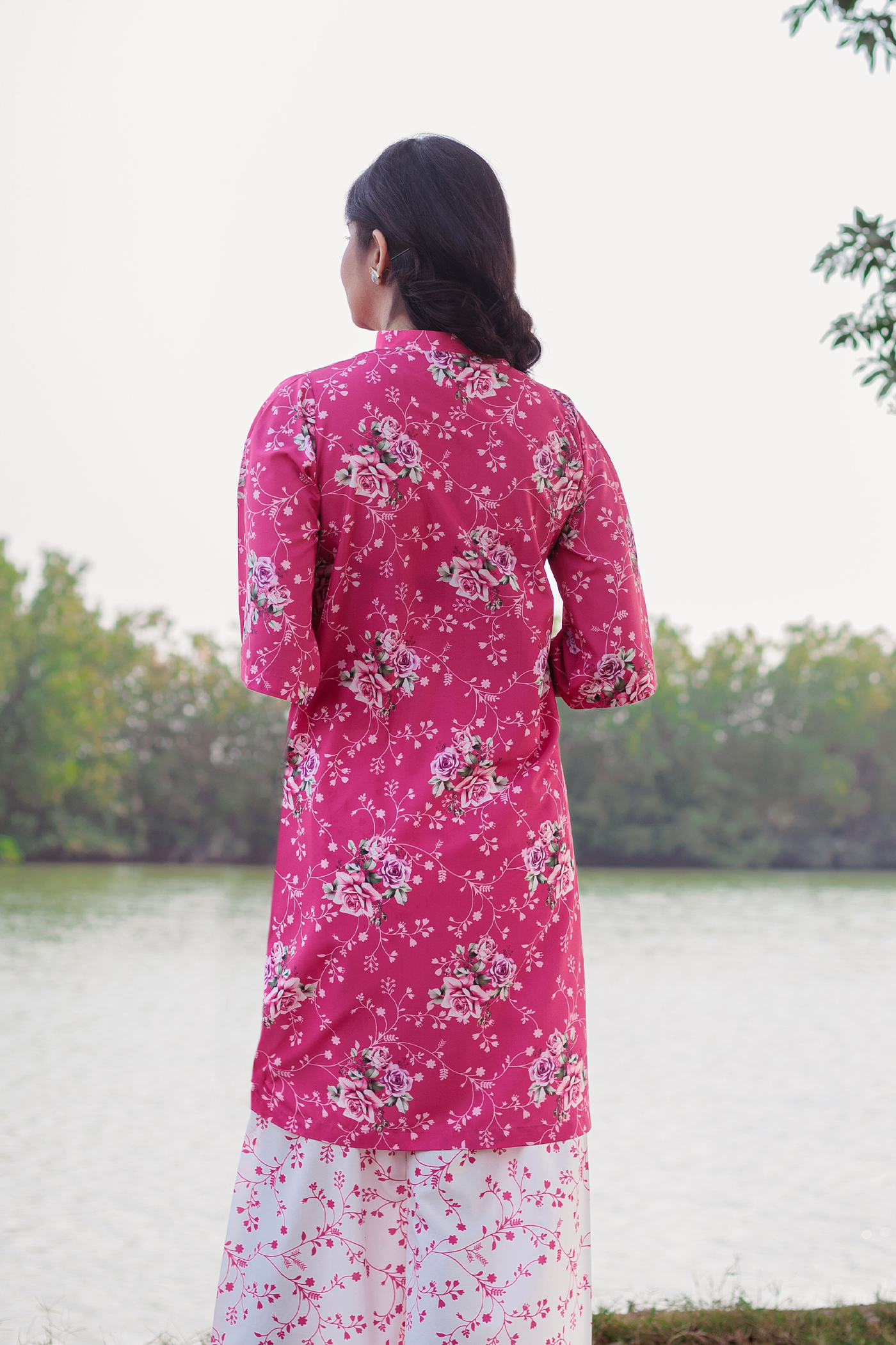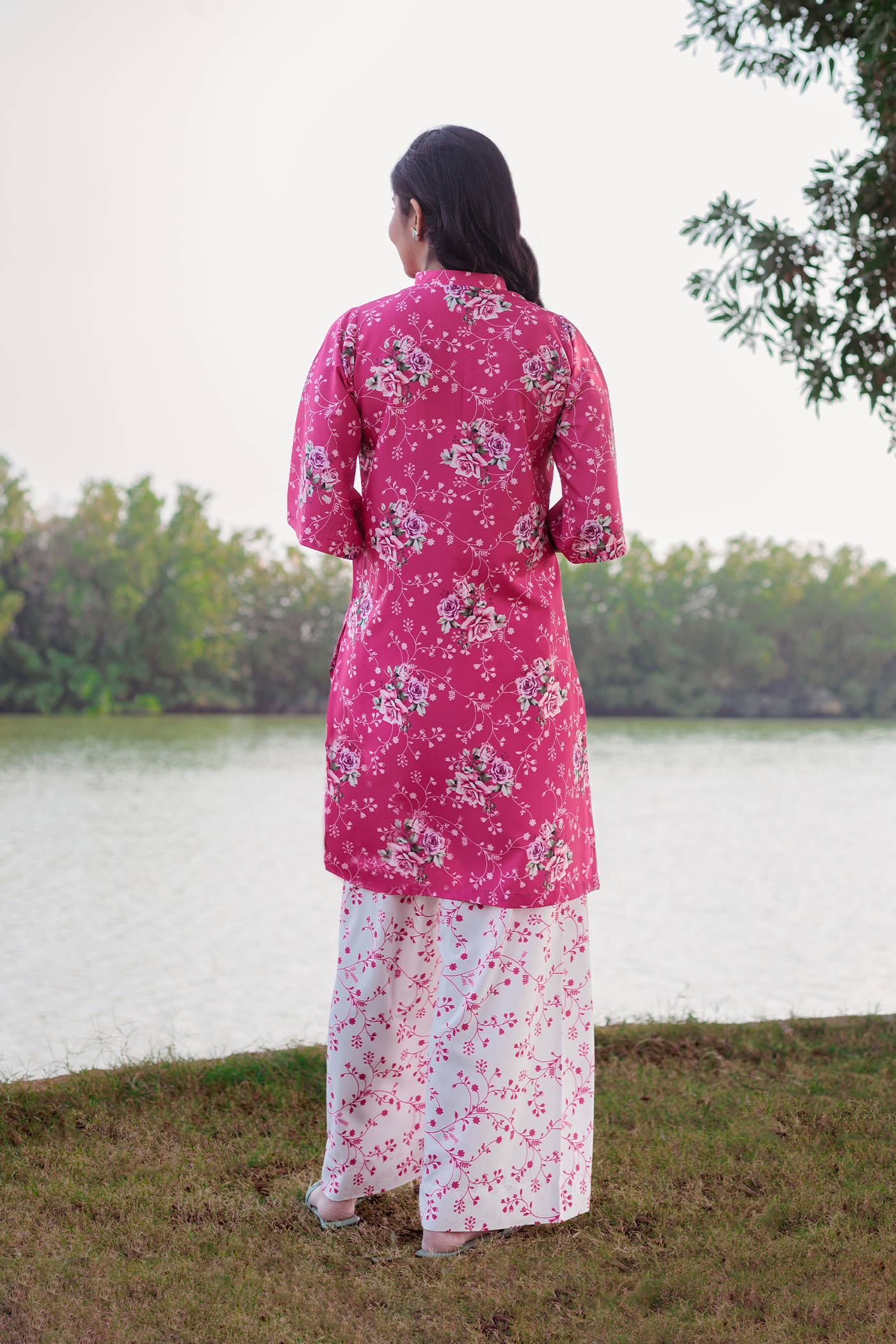 Step into effortless elegance with the Luna Co-Ord Set from the TS.CO-ORDS collection. This ready-to-wear masterpiece is crafted from luxurious crepe fabric that’s wrinkle-free, all-season, and super comfortable. The vibrant floral-printed pink kurta, featuring intricate detailing on the neckline with half sleeves, is paired with wide-leg white contrast printed pants for a polished look. With high-quality stitching, Luna guarantees a flawless fit and enduring style.