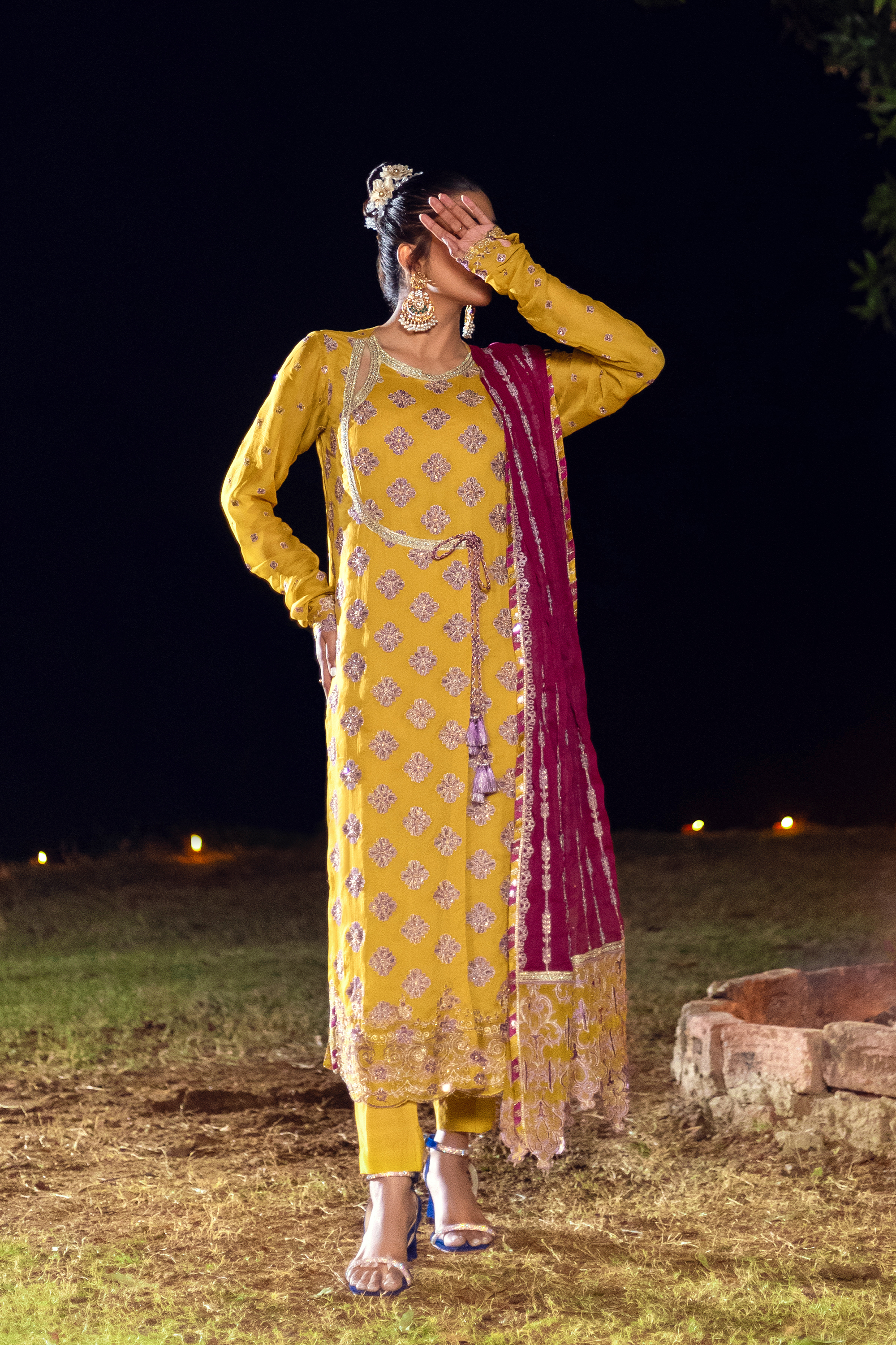 Crafted in luxurious chiffon, Meerab offers a graceful fall that enhances its ethereal appeal. The shirt and dupatta, made from chiffon, drape beautifully, giving the outfit a light and airy feel. The trousers, tailored from premium Indian raw silk, add structure and refinement, completing the ensemble with a polished touch.