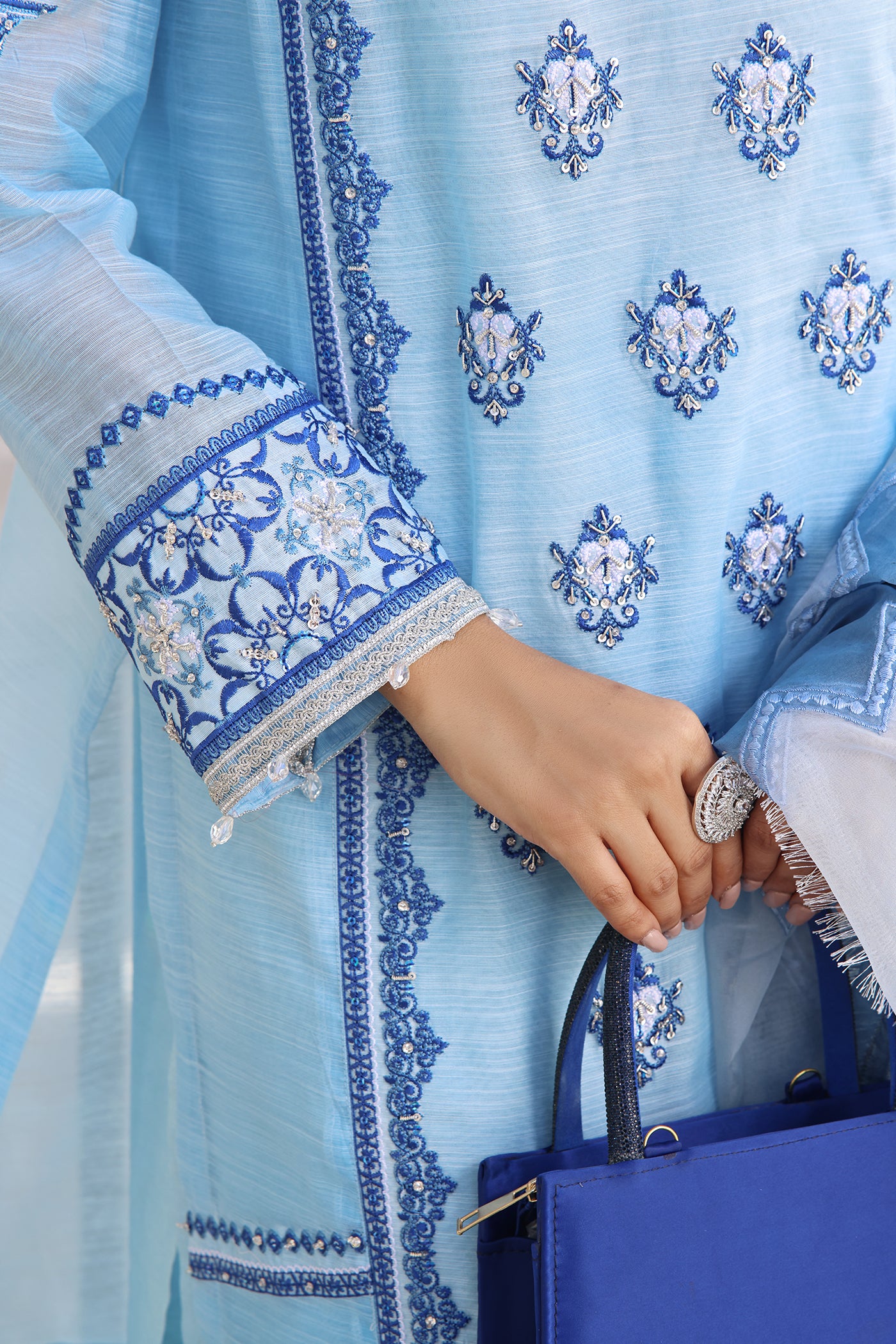 Achieve a stunning, show-stopping look with this luxurious traditional ensemble. A beautiful Munnar blue adorned with mesmerizing embroidery and scintillating embellishments, a classic straight trouser with a captivating zig-zag design organza dupatta completes this aesthetically rich composition, making it a perfect style statement for all your festive soirées.