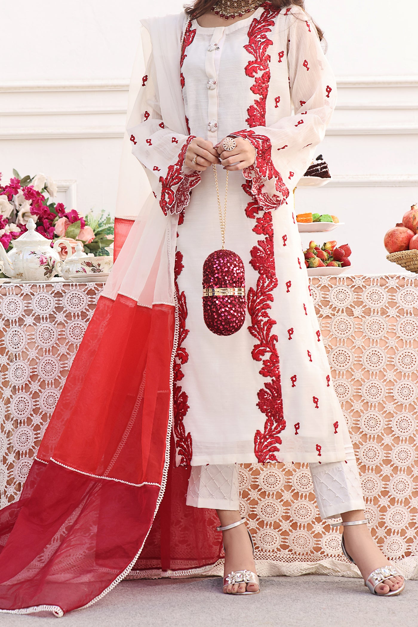 It’s a graceful white monar shirt with heavily embellished front and sleeves. The dainty embellishments are in white pearls. It comes with raw silk embellished pants and a gorgeous dupatta with lace border on all four sides and a chatta patti effect on both sides connecting with pearl lace. Perfect for a day event.