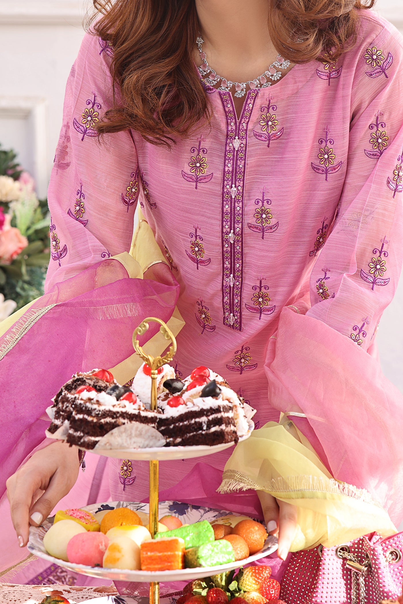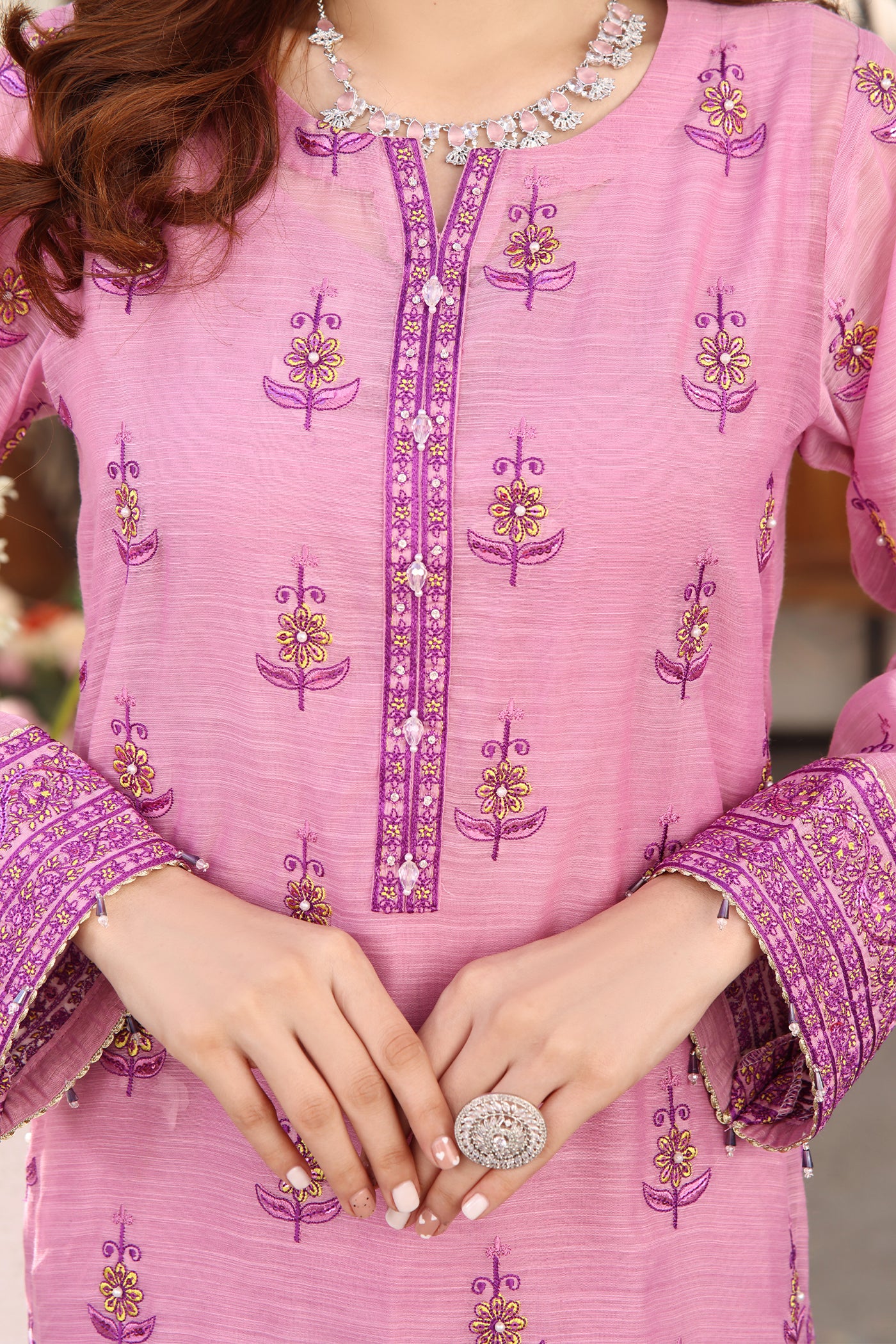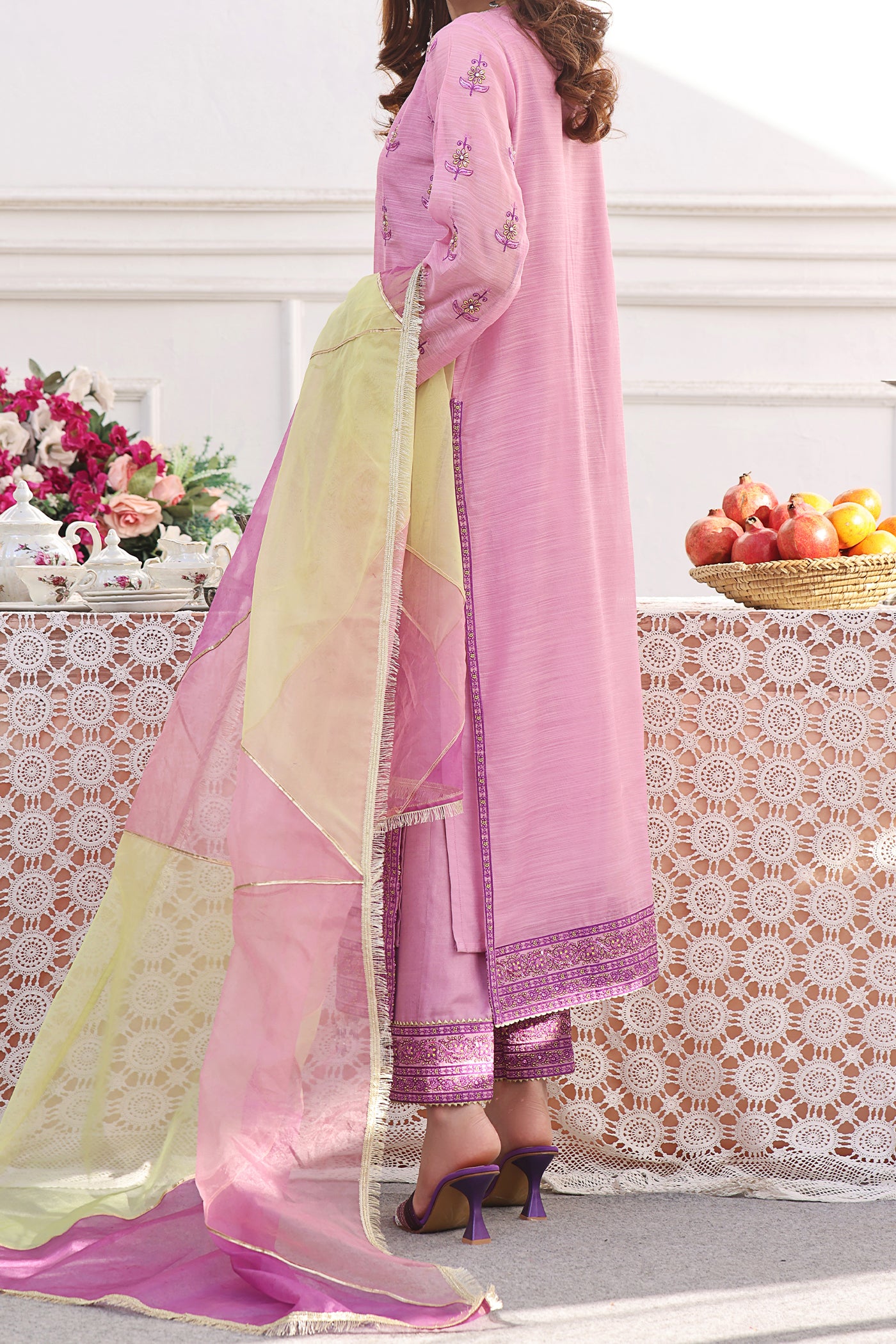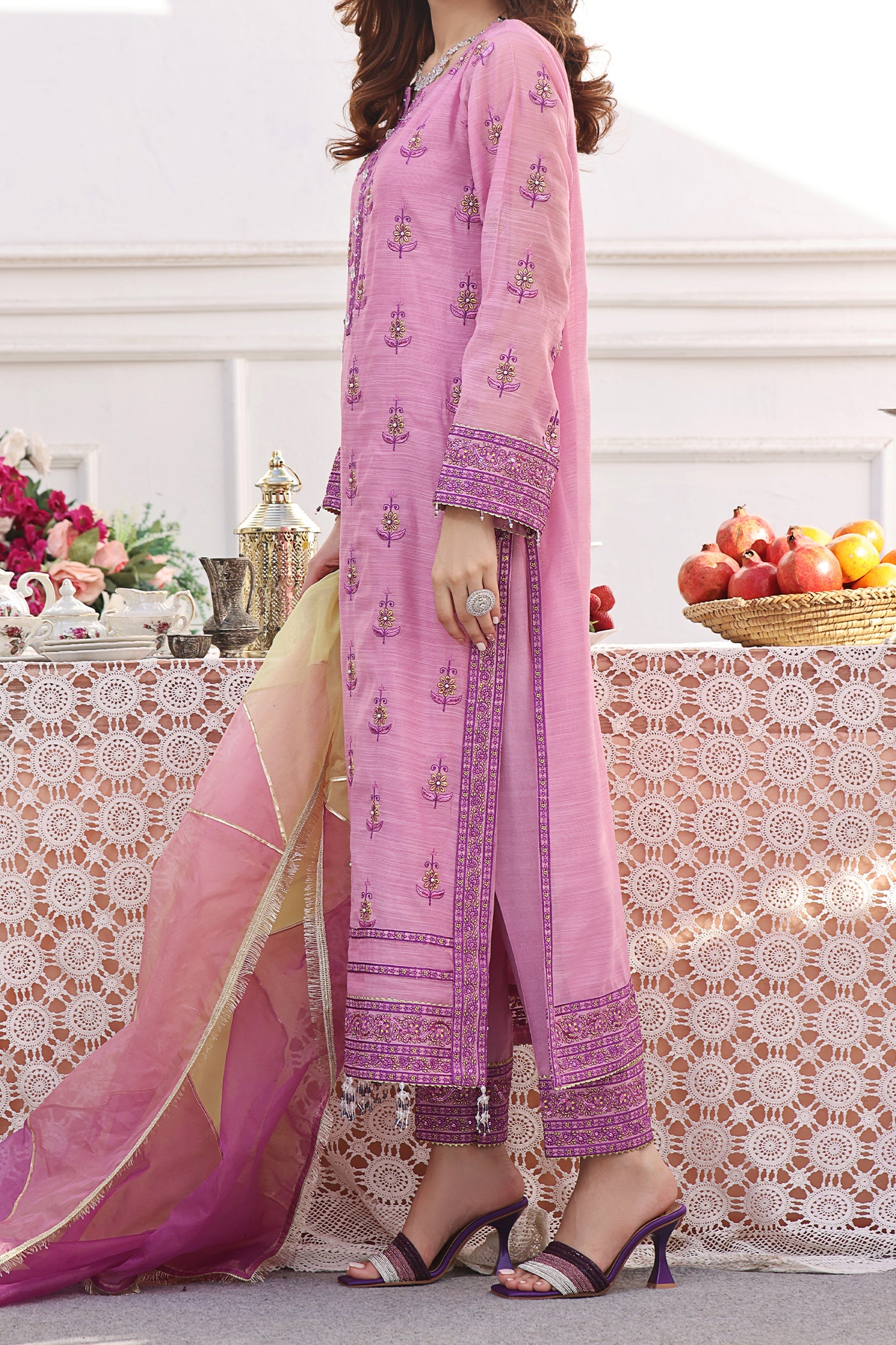 This elegant carnation pink dress is adorned with embroidery, a breathtaking array of traditional adda work, featuring the intricate artistry of sequins, dabka, pearls, moti, and tassels on the border. Every stitch is a testament to impeccable craftsmanship. The dupatta is adorned with gota, and the trouser is classically embroidered border. A perfect statement style for a festive occasion.