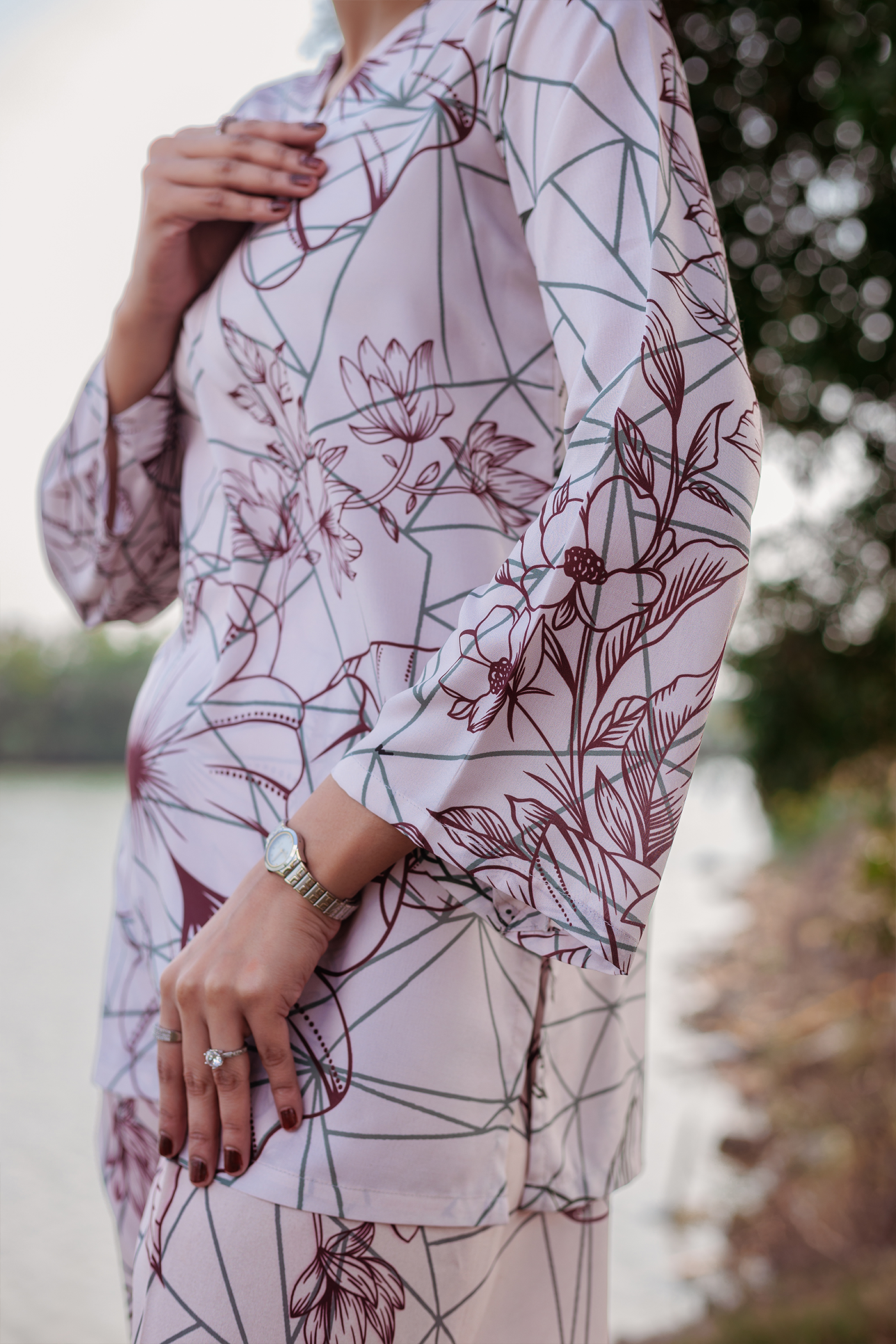 Experience the elegance and comfort of the Sofia Co-ords Set from the TS Co-ords Collection. Made from luxurious wrinkle-free crepe fabric, this ready-to-wear masterpiece features a floral outlines print and intricate detailing. The short kurta and wide-leg pants offer a polished look with high-quality stitching for a flawless fit and enduring style.