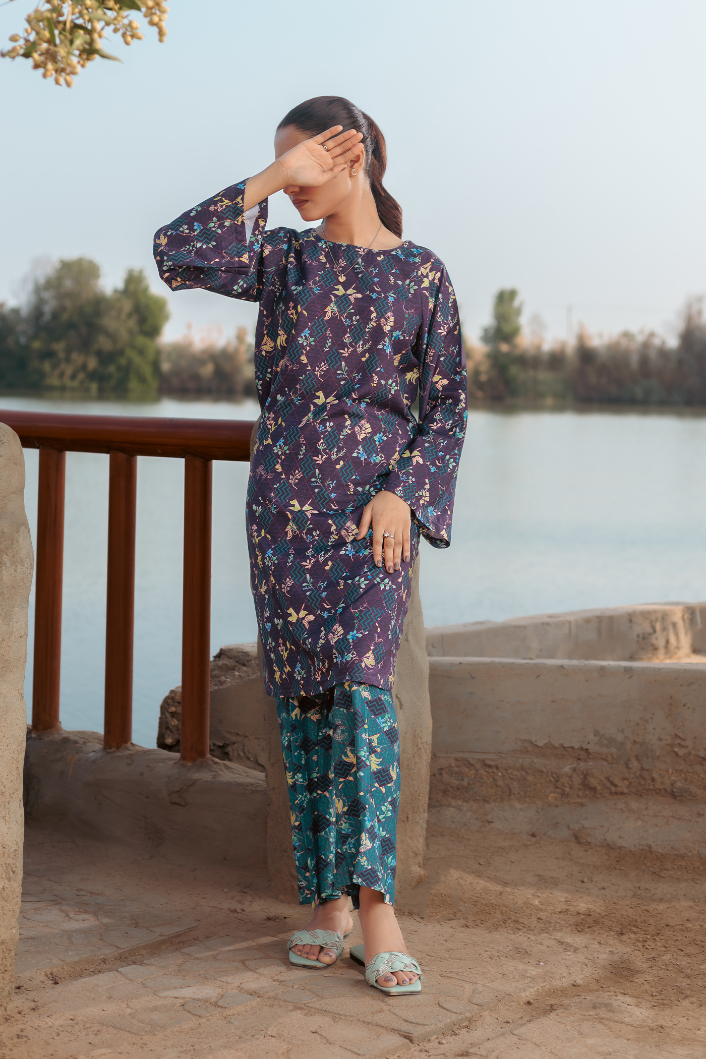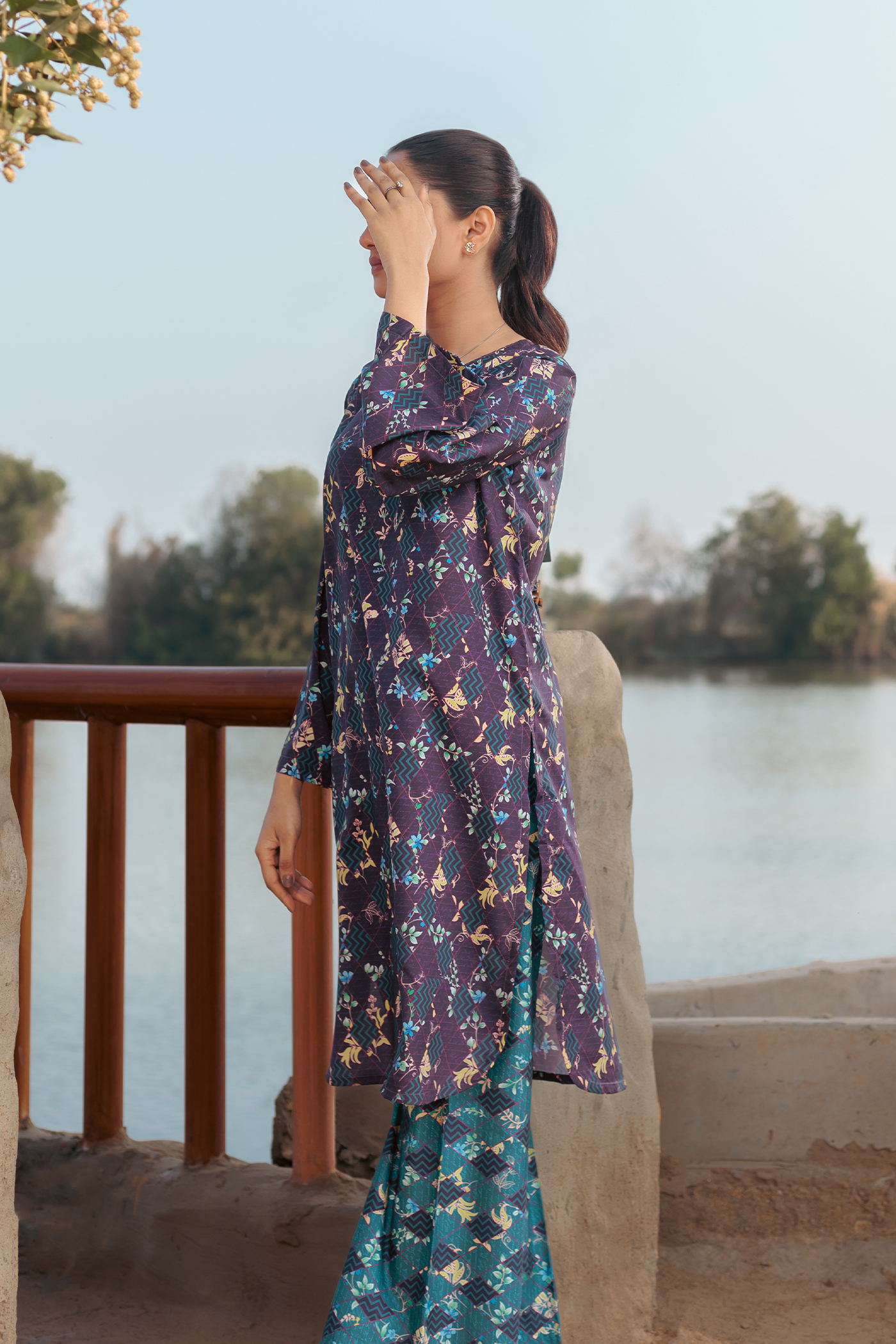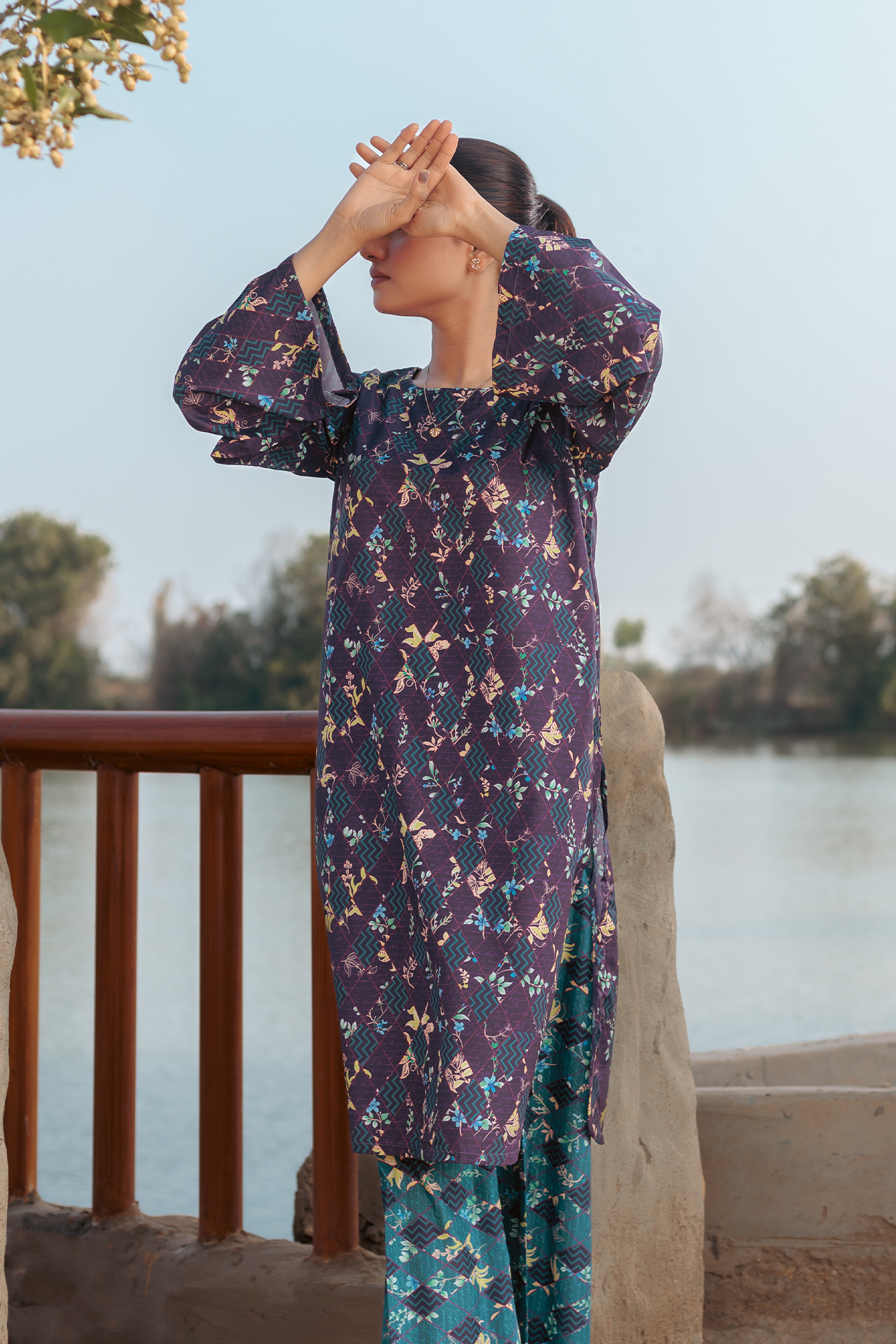 Discover effortless elegance with our Viola Crepe Co-ords. The base violet and ocean green color scheme is complemented by a multi-color box and floral print, giving a touch of vibrance to this outfit. The kurta and wide-leg pants offer a comfortable and chic look.