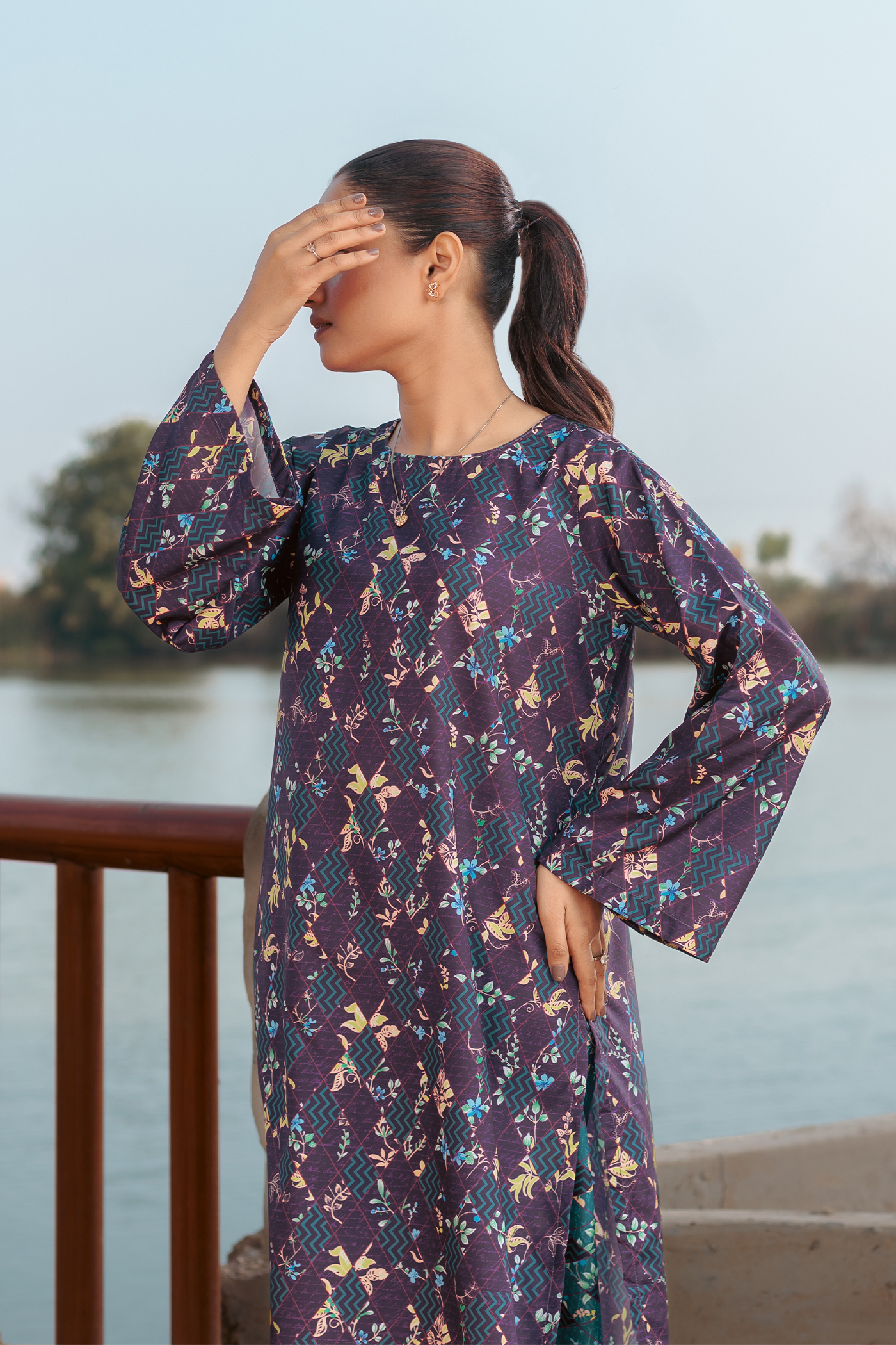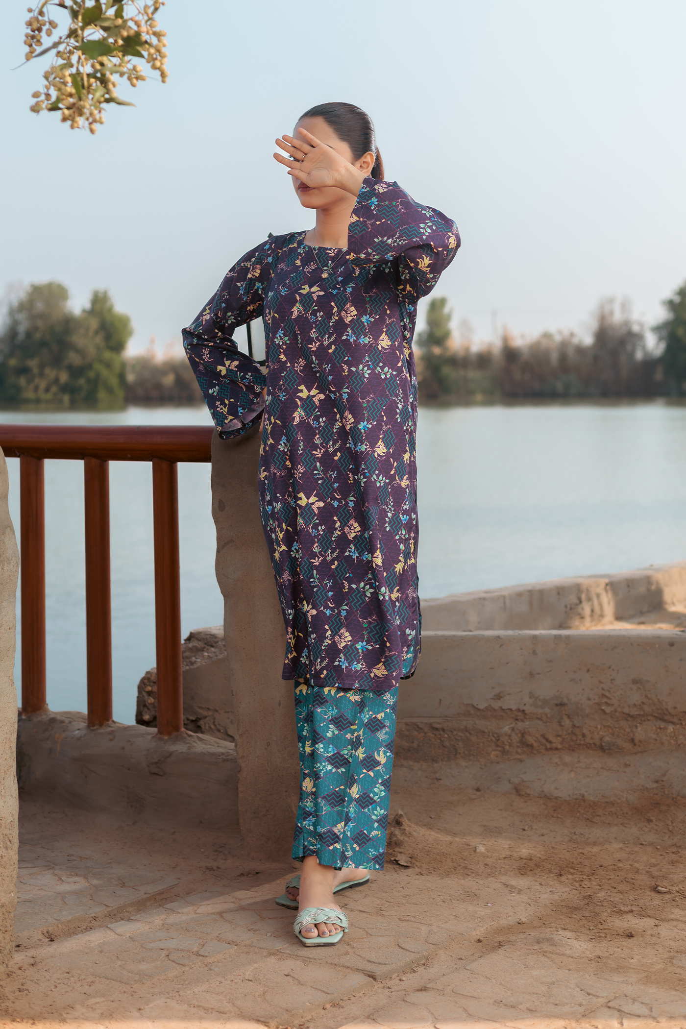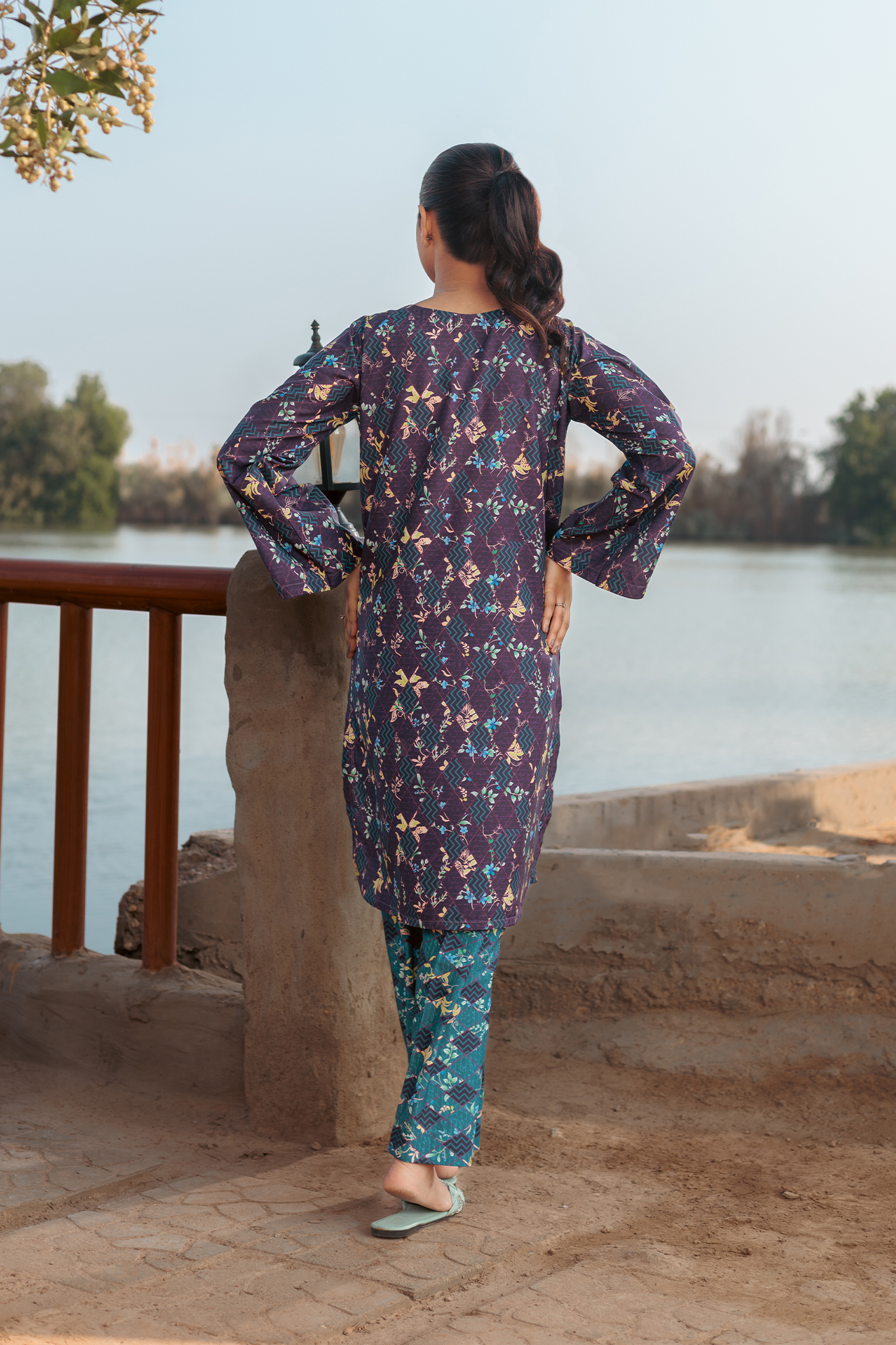 Discover effortless elegance with our Viola Crepe Co-ords. The base violet and ocean green color scheme is complemented by a multi-color box and floral print, giving a touch of vibrance to this outfit. The kurta and wide-leg pants offer a comfortable and chic look.